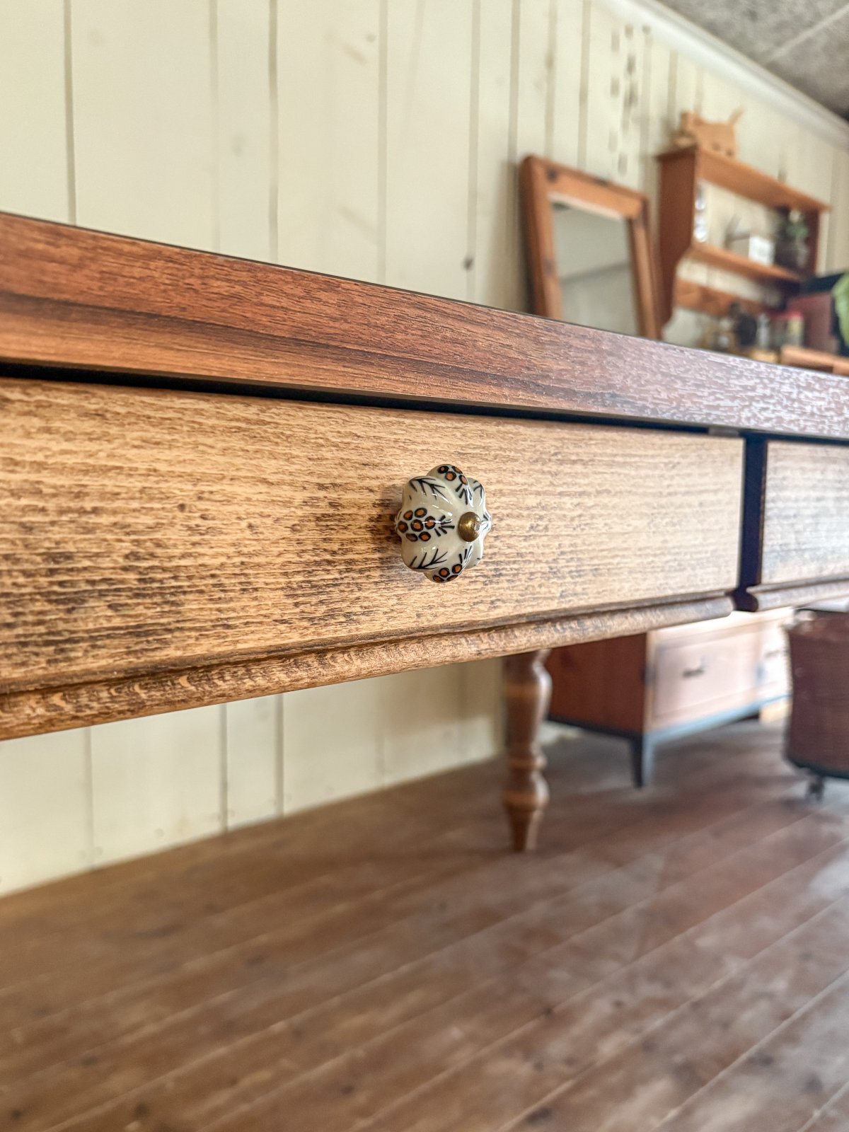 (3)アンティーク加工(汚し加工)を施してあります。 色ムラ、木目が浮いている箇所もあります。届いた時からアンティーク家具の様な『落ち着いた雰囲気』を 楽しんでいただけます。 綺麗な商品をお好みの方はご遠慮下さいませ。なるべく綺麗めで、激しく傷つけて、など調整も可能です。