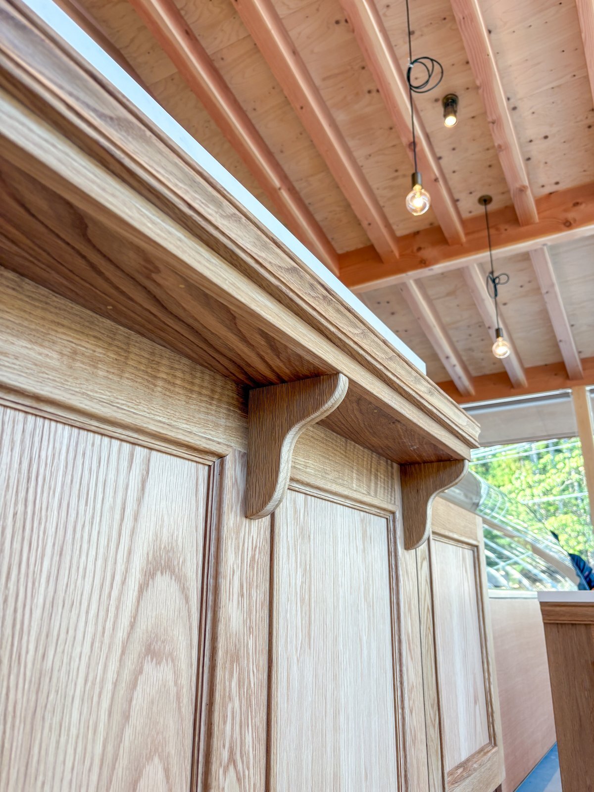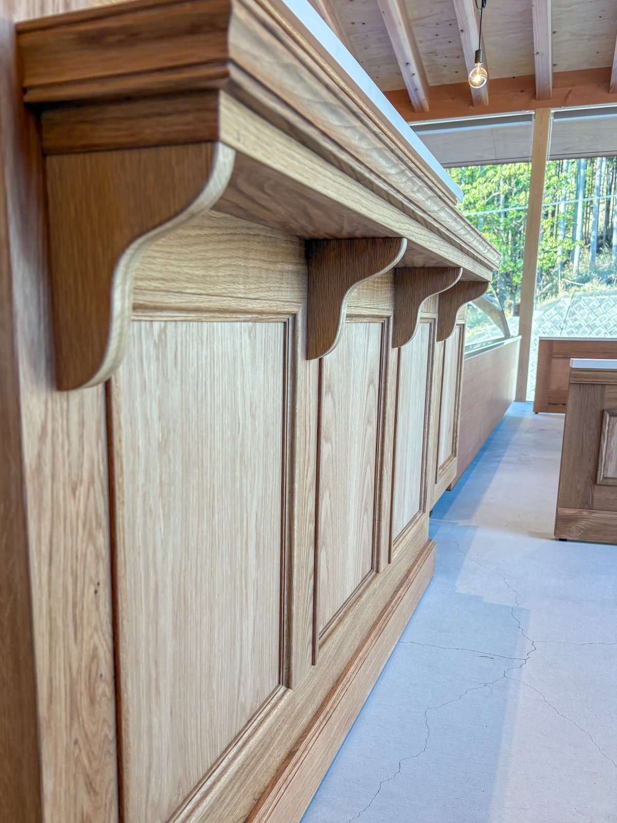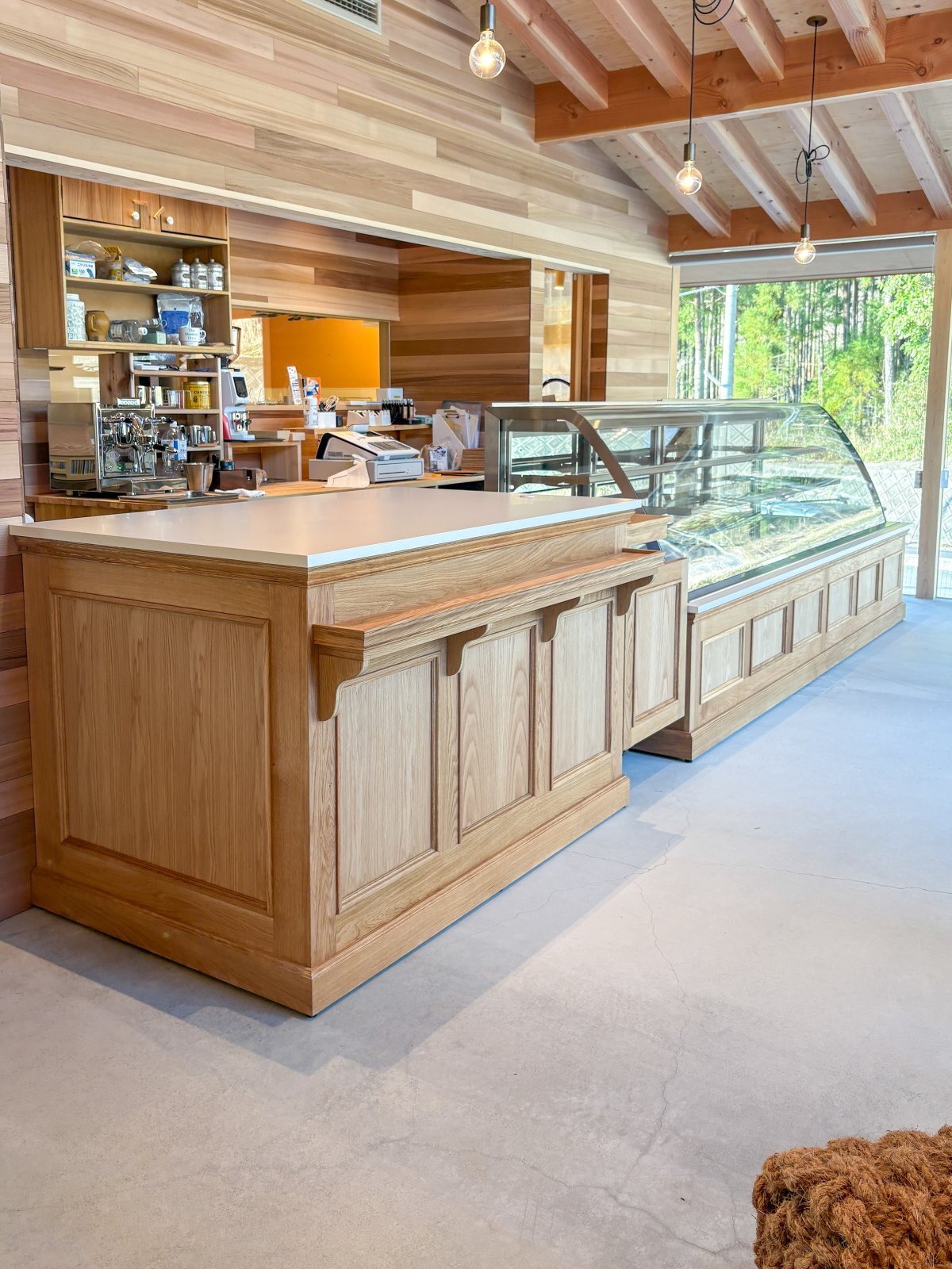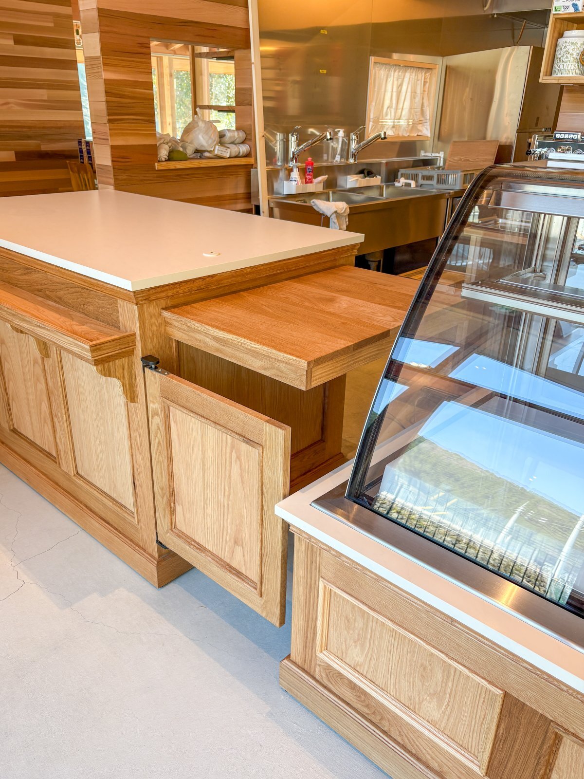 併設のカフェに、ホワイトオーク無垢材を使った大きなレジカウンターセットを製作させていただきました。