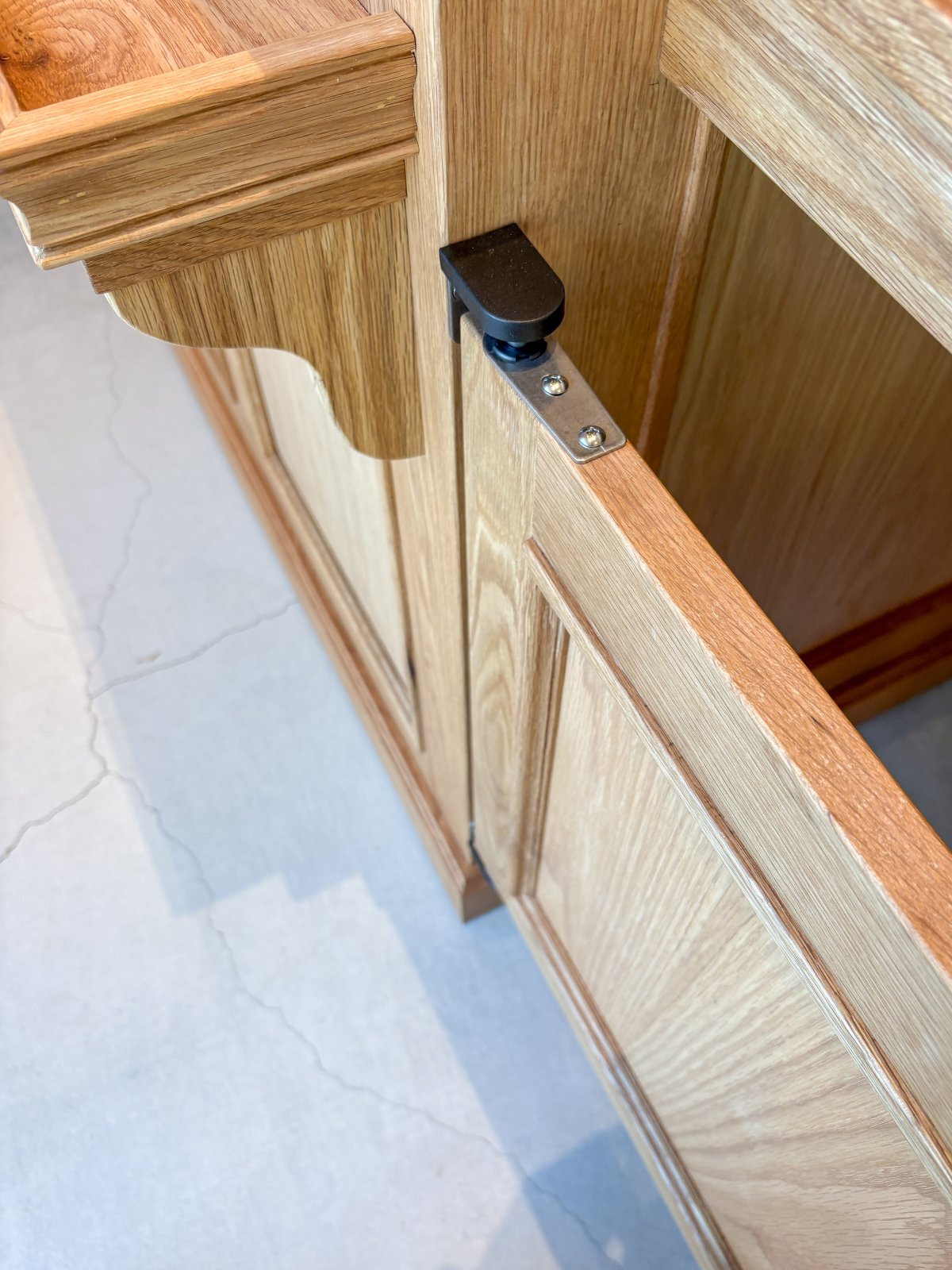 レジカウンターと冷蔵ショーケースの間に、行き来ができるスイングドアを設置しました。