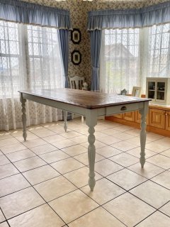 シャビーグレーの天板に、大人っぽいブルーグレーのツートンペイント、海外インテリア風のおしゃれなテーブルです。