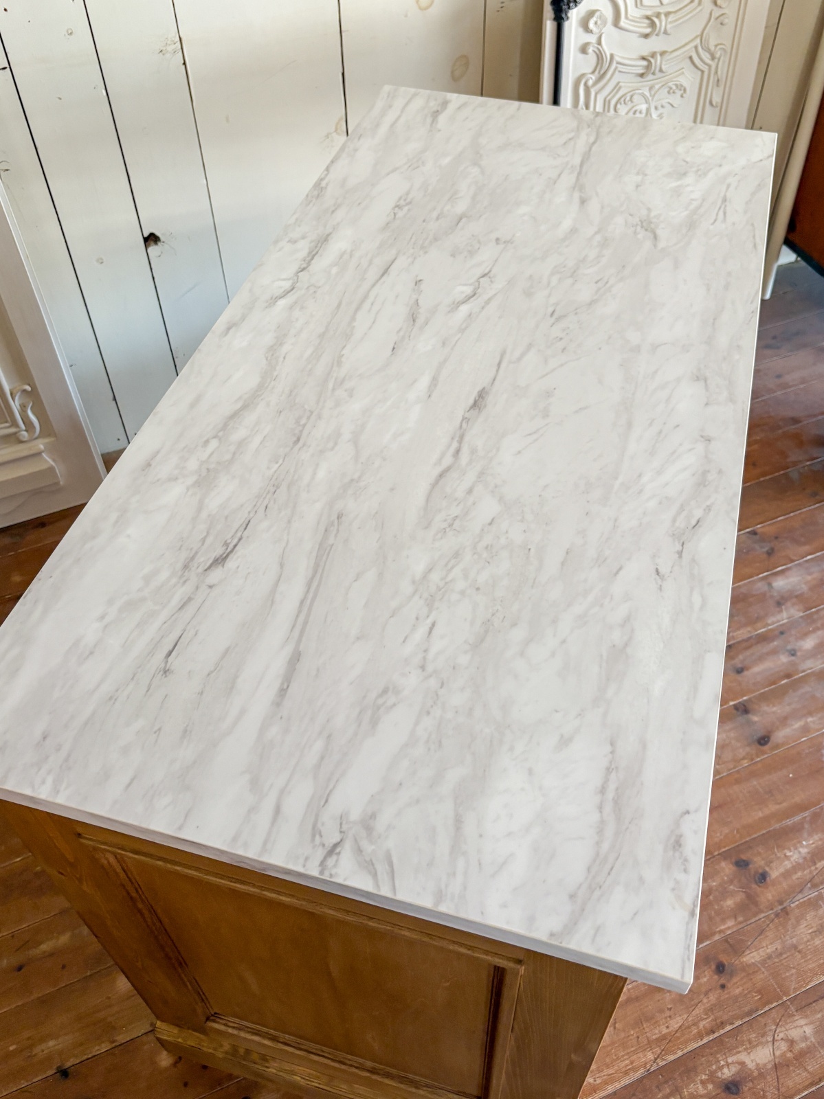 メラミン化粧板の天板、写真は大理石柄LJ802Kです。