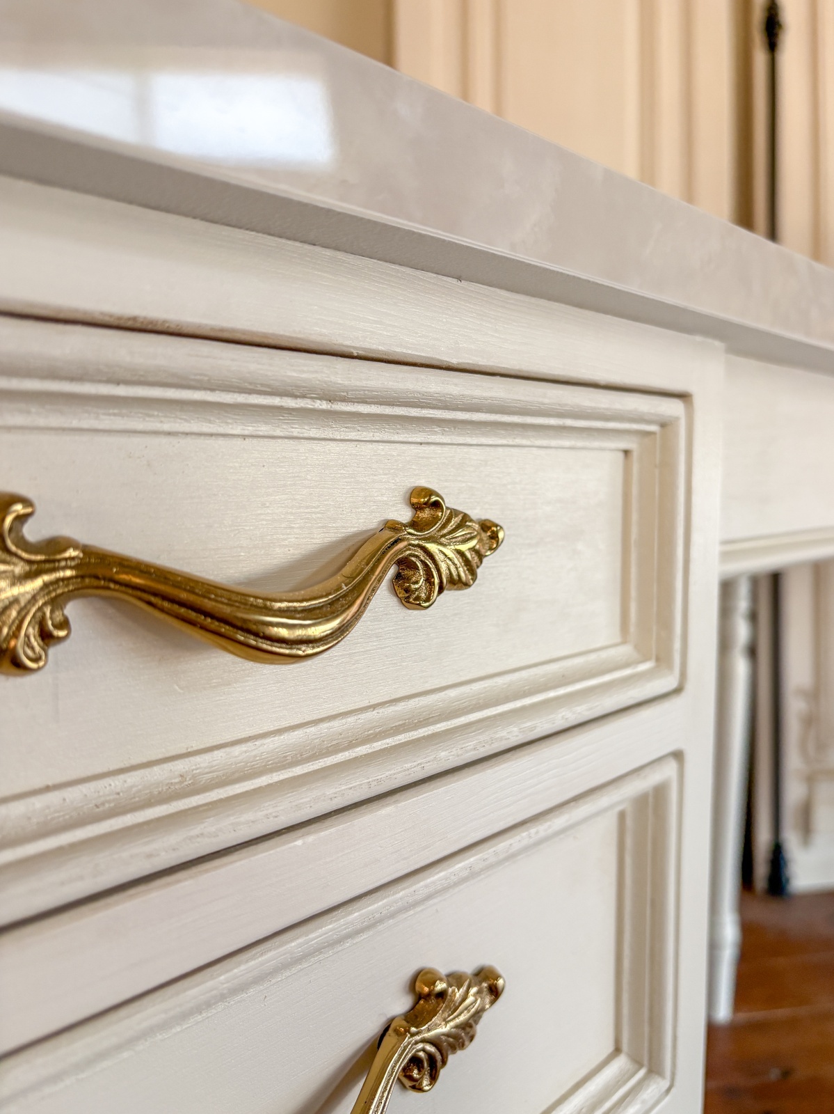 モールディング装飾を施したチェスト。豪華な真鍮取っ手をを取り付けました。