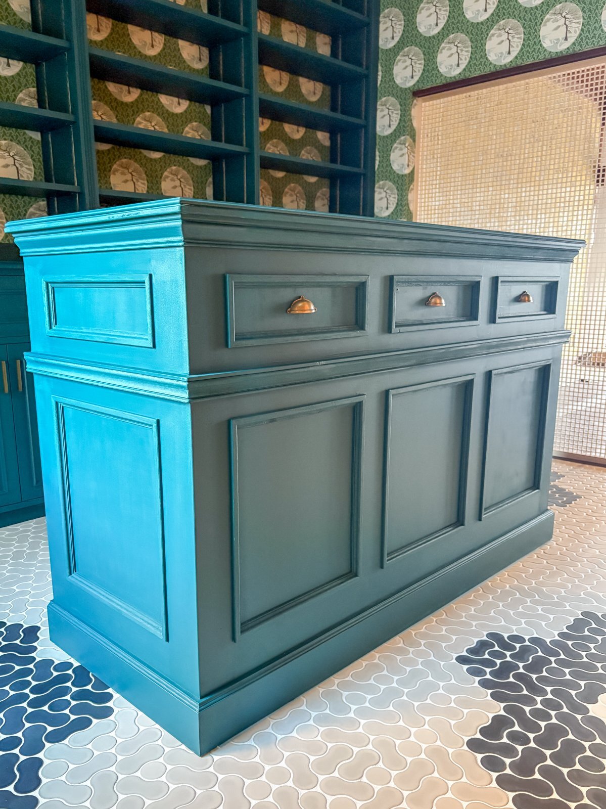 目を引くグリーンは設計士さんが選んだ特注カラー、クラシックアンティーク調のレジカウンターです。