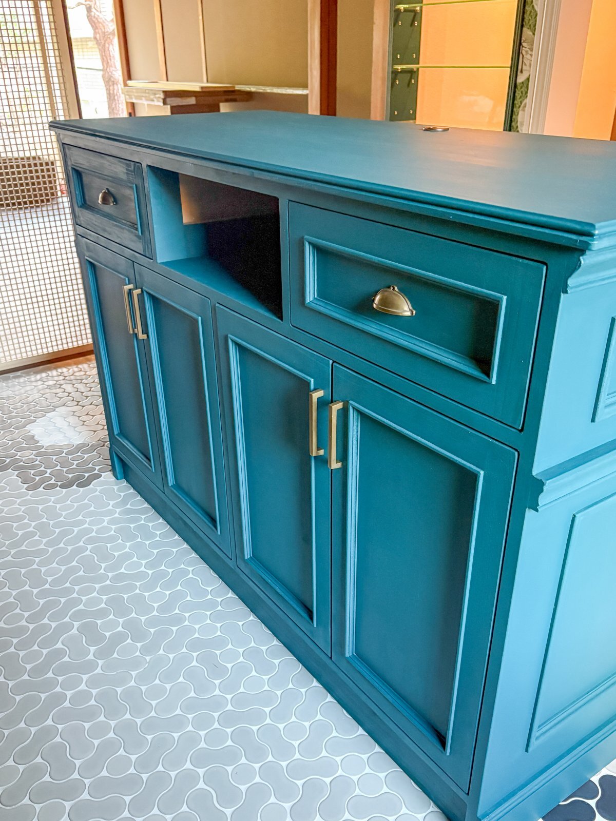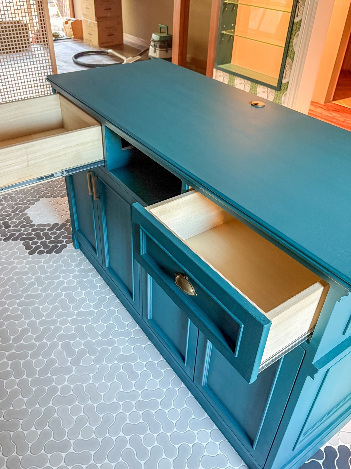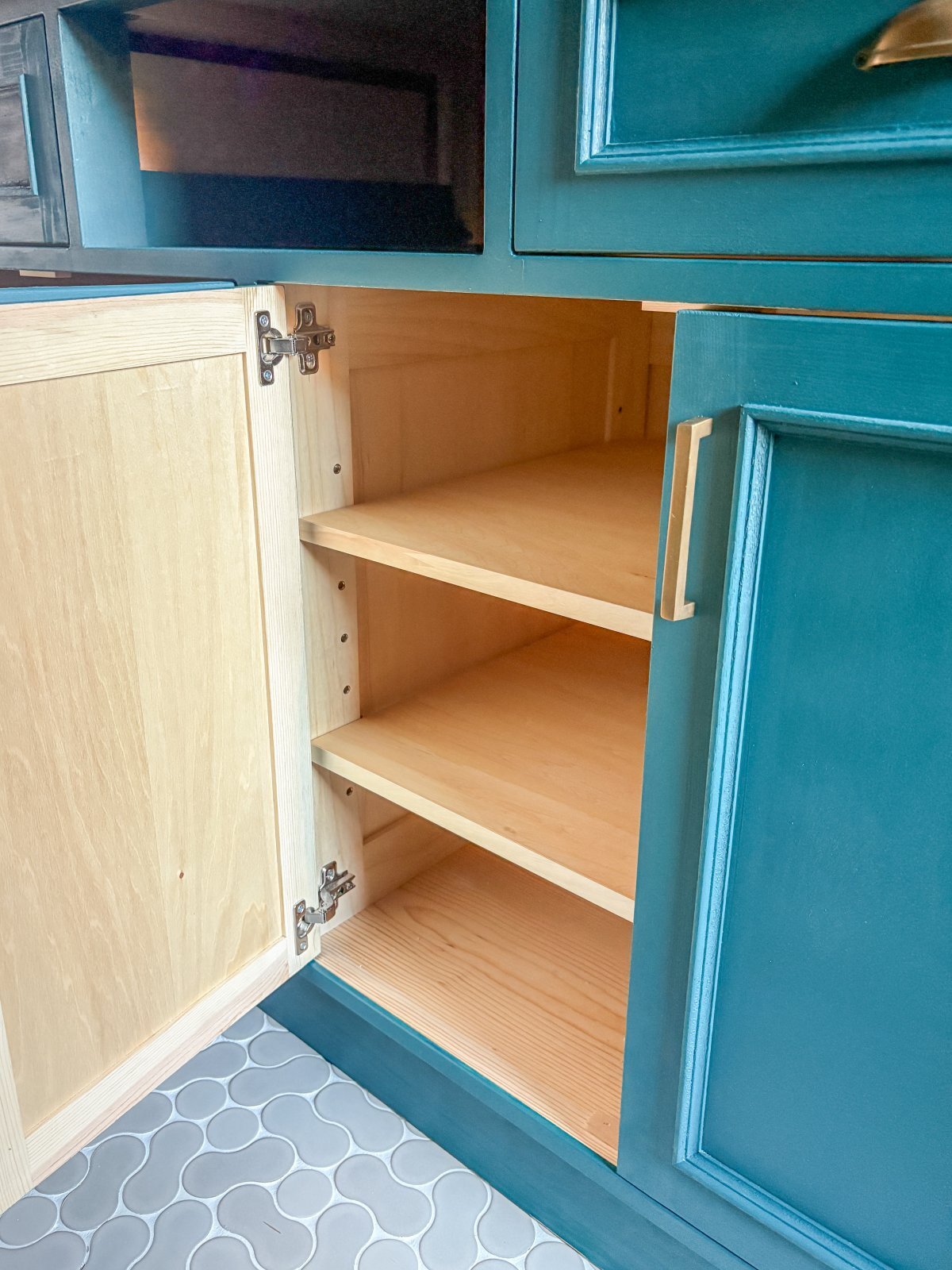内側上部には引出し2杯、オープン収納、下段には観音扉と中に可動棚を設置しました。
