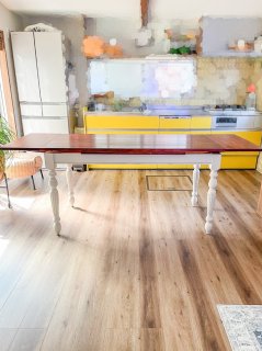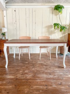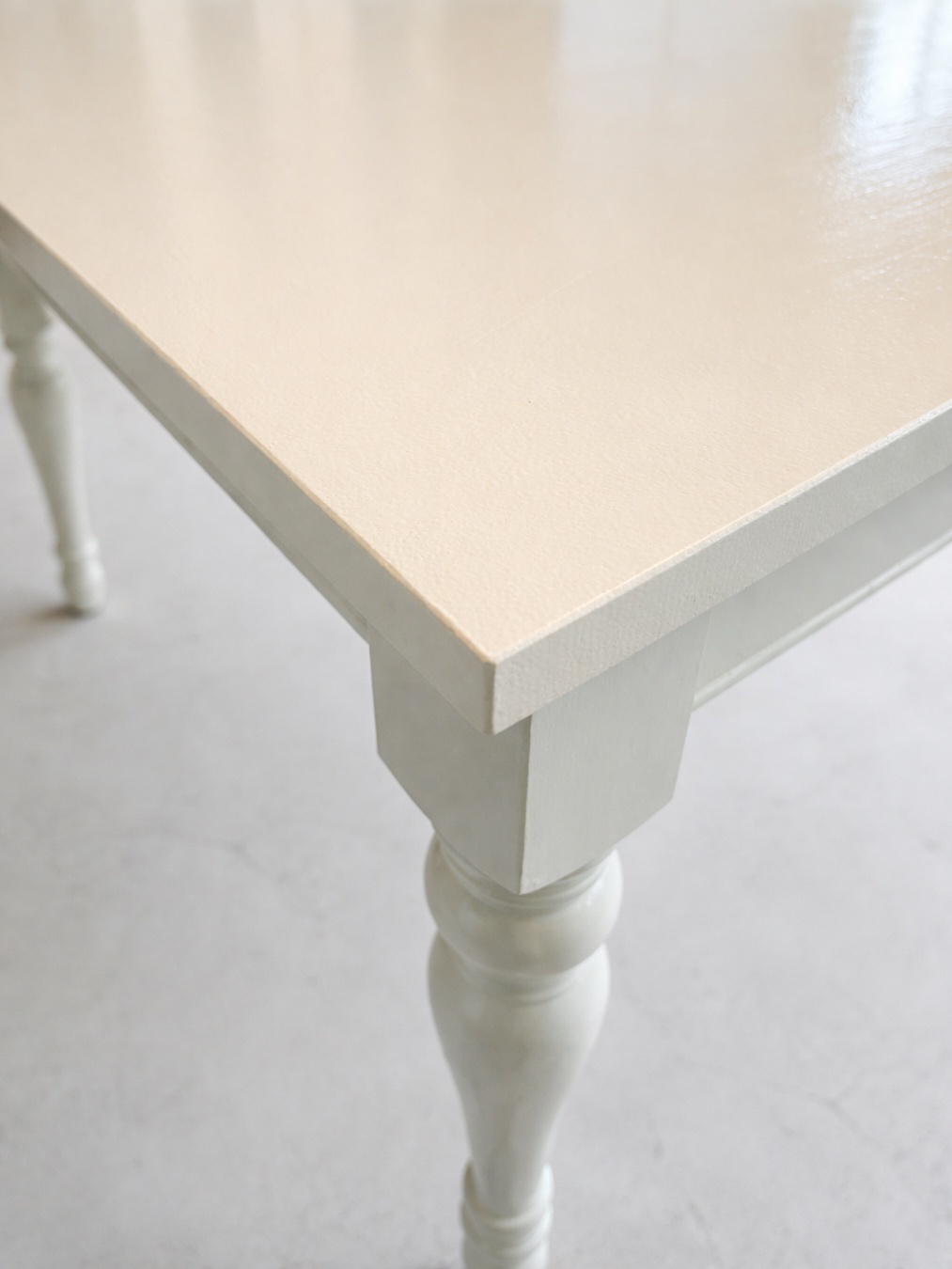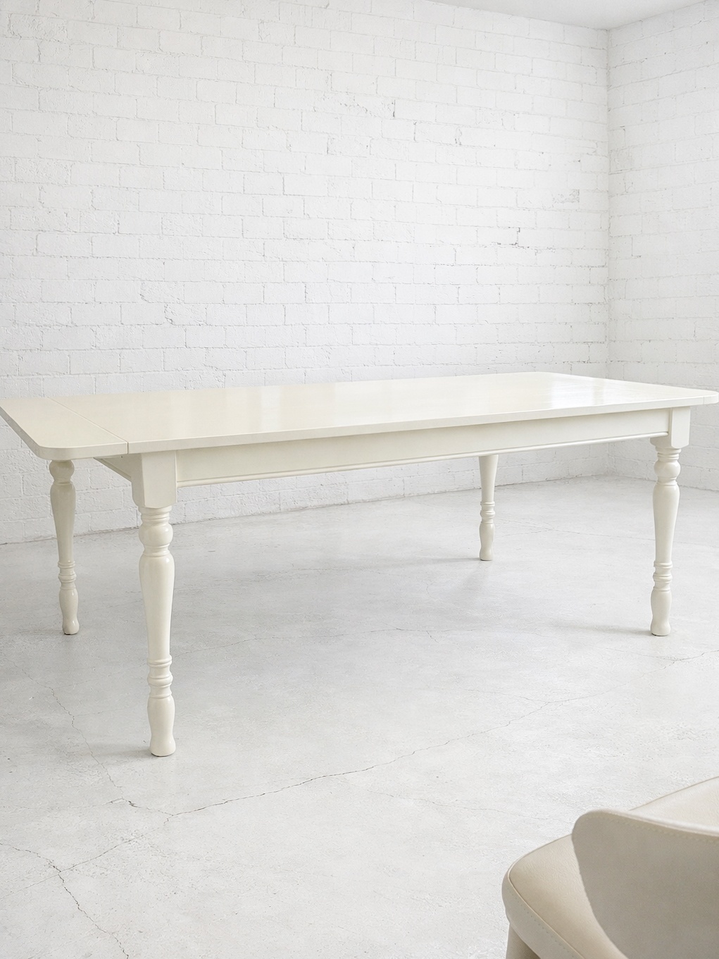 アイボリーペイントで仕上げた、伸長式ダイニングテーブル。