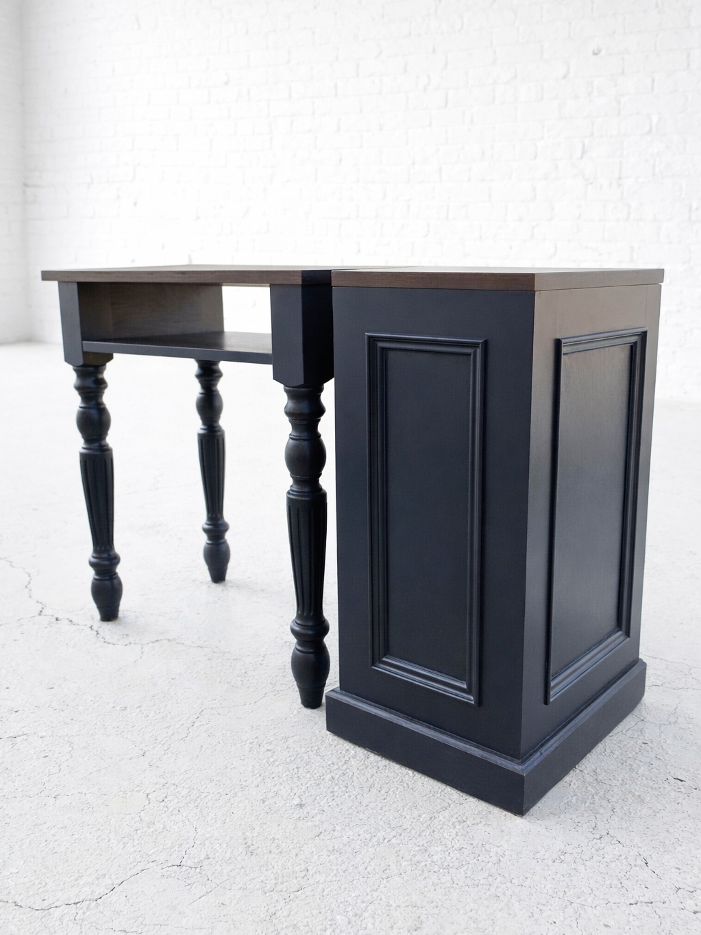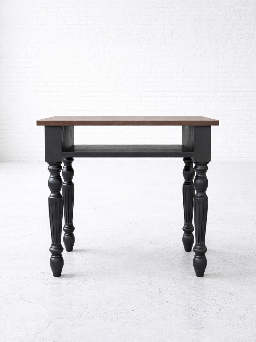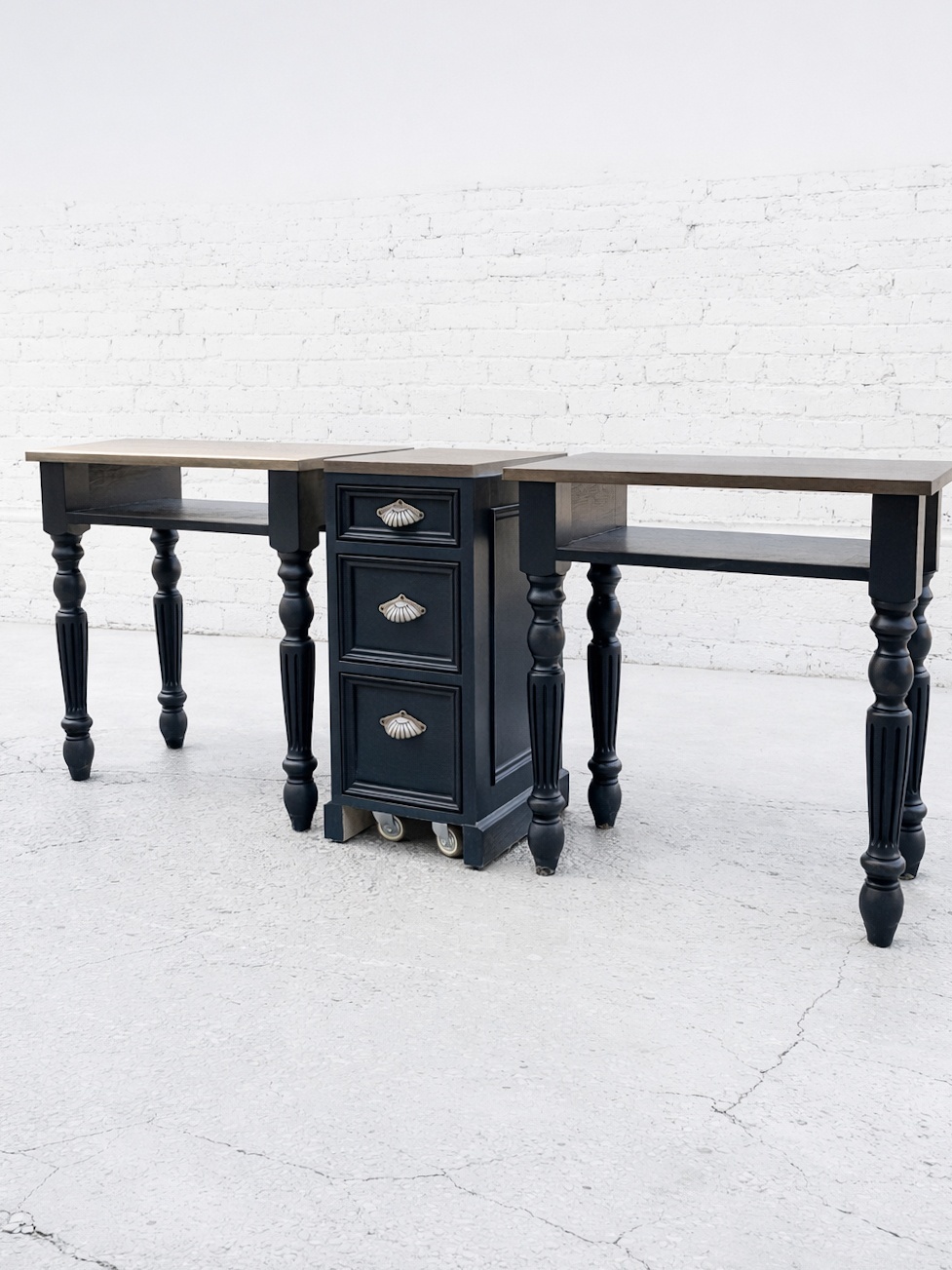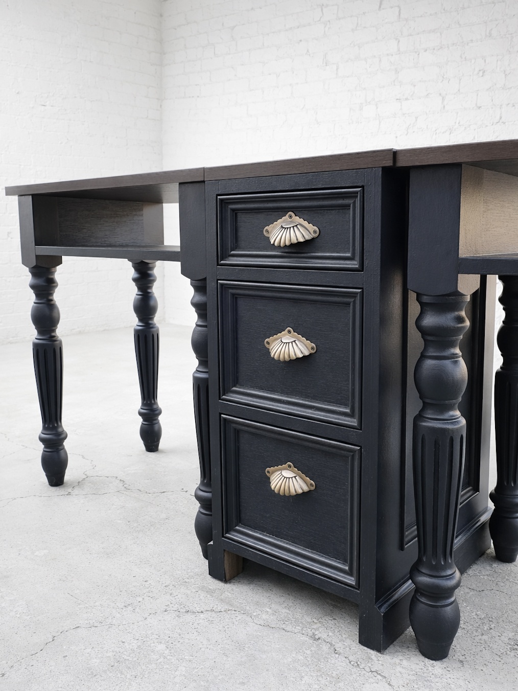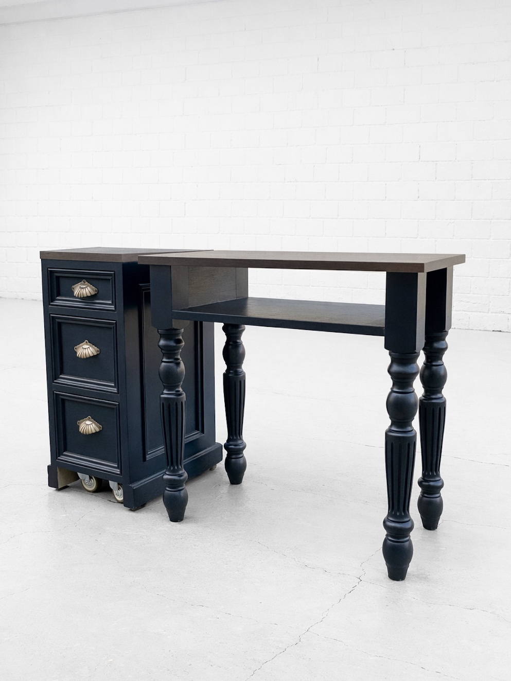 ターンドレッグ(ろくろ脚)とウォールナット木目調のメラミン天板、シックなブラックリリー色でペイントしたネイルデスクです。