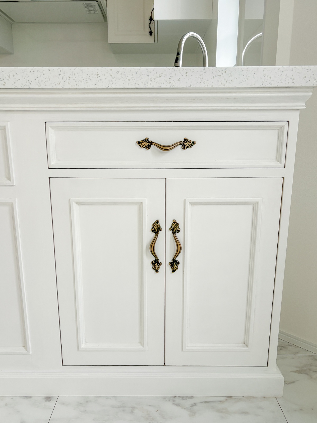 モールディングを使って装飾した、海外インテリア風のおしゃれなキッチンカウンターです。