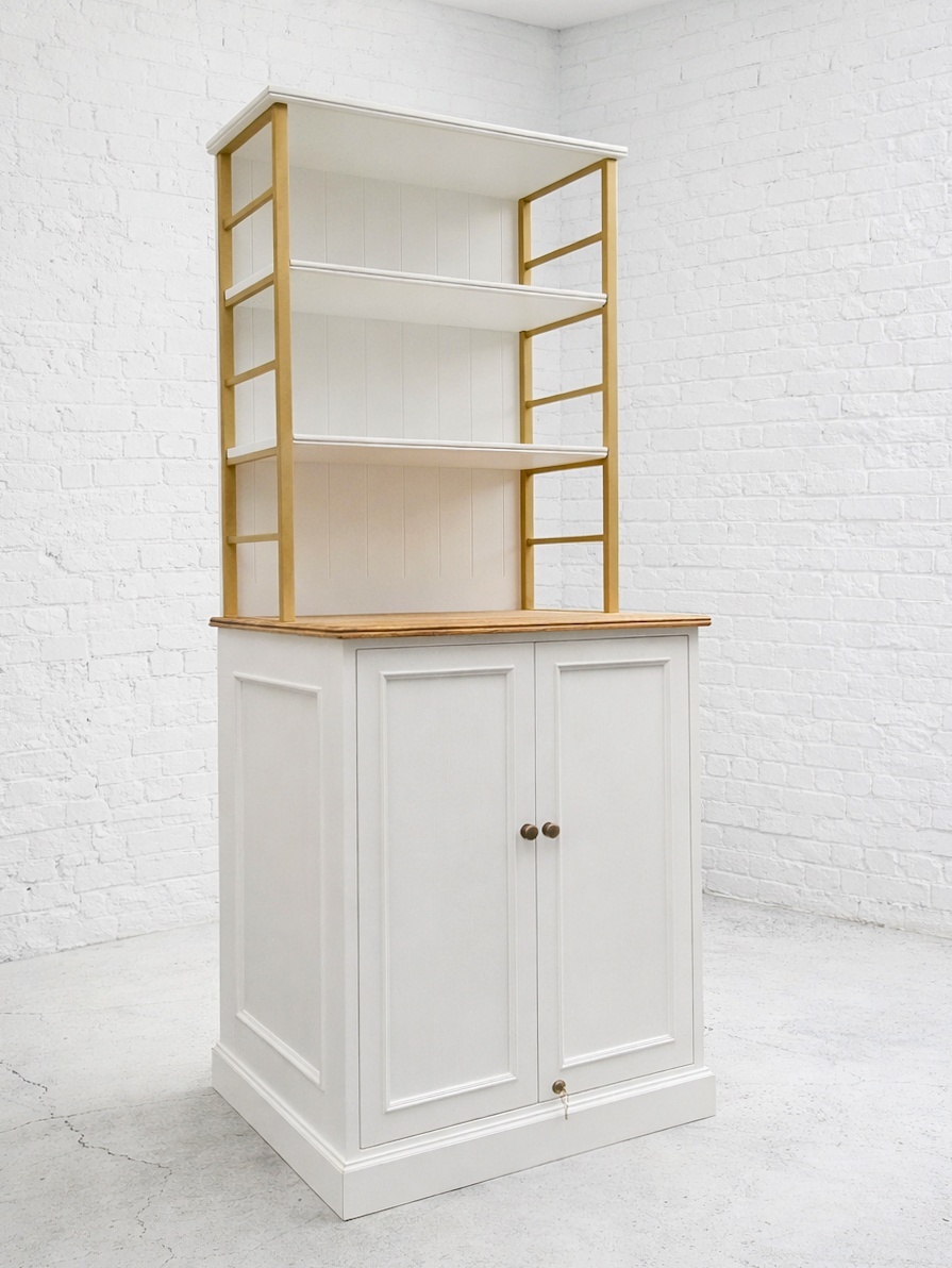 真鍮の棚枠を使ったオープンシェルフ&キャビネットのディスプレイ什器。