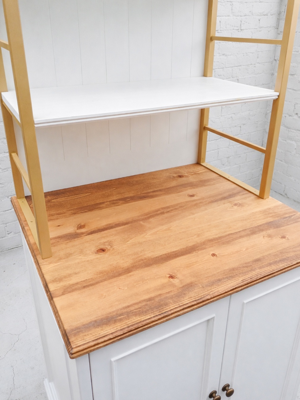 キャビネットの天板はパイン無垢材で、ナチュラルな雰囲気を使いました。