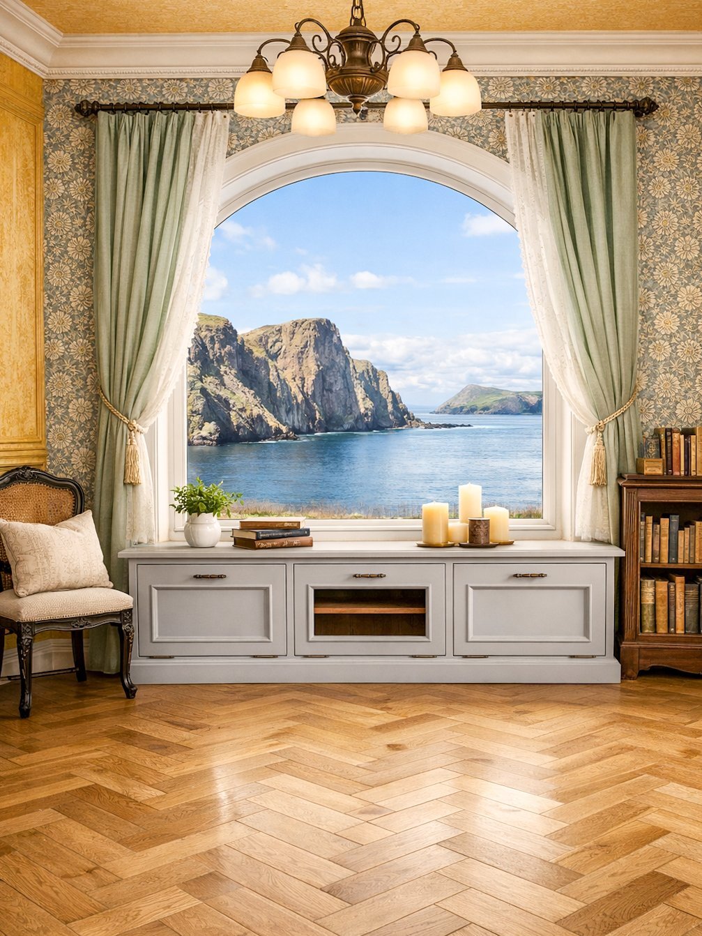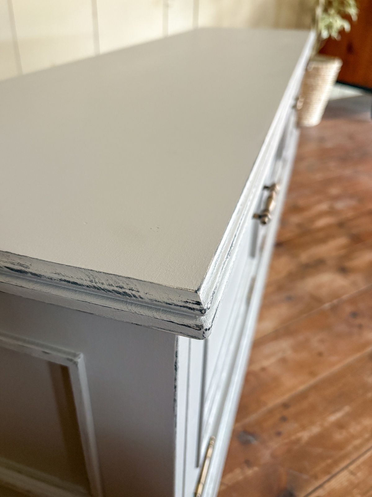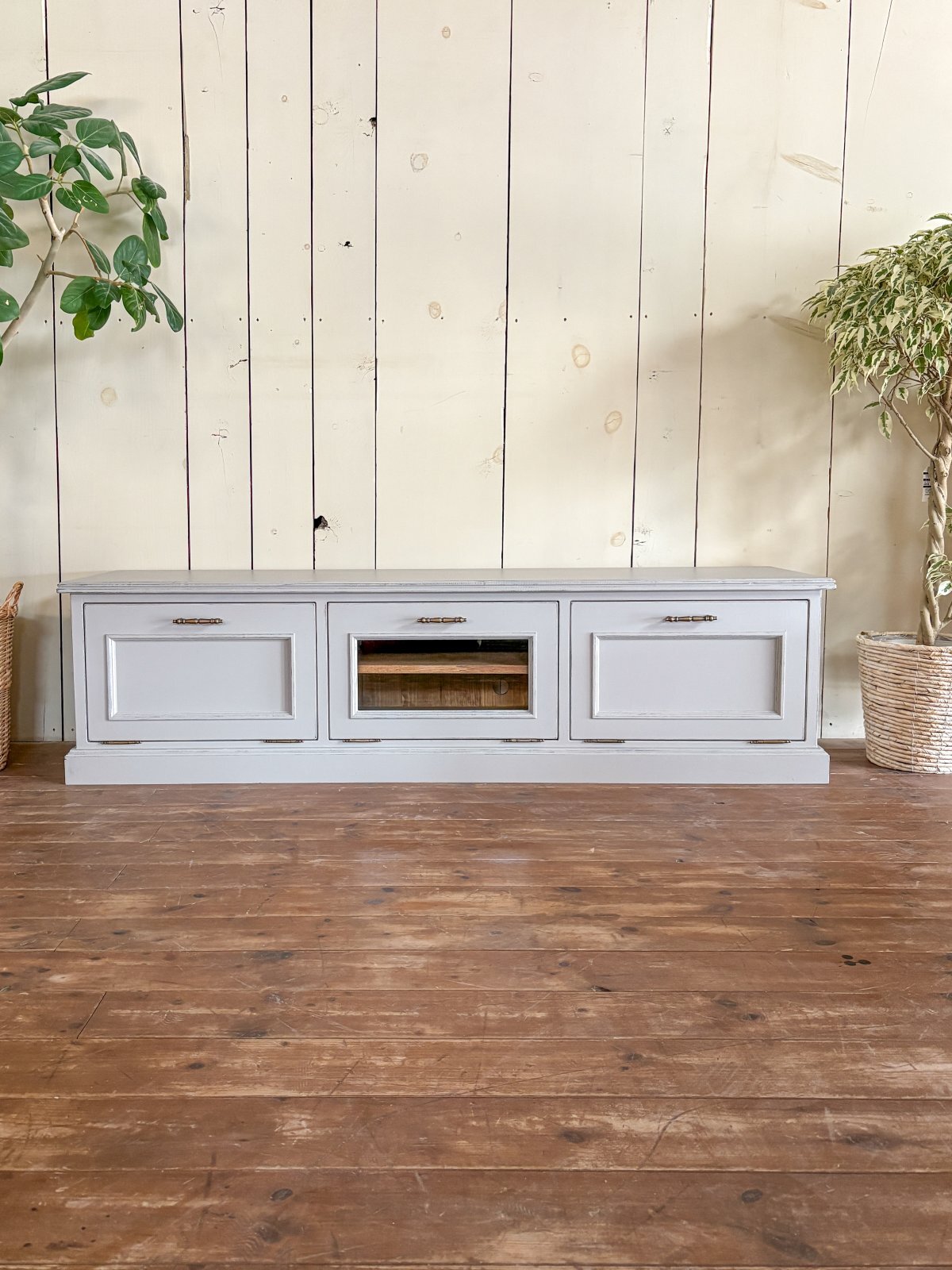 モールディング装飾やエイジングペイントを施した、アンティーク調デザインのテレビボードです。