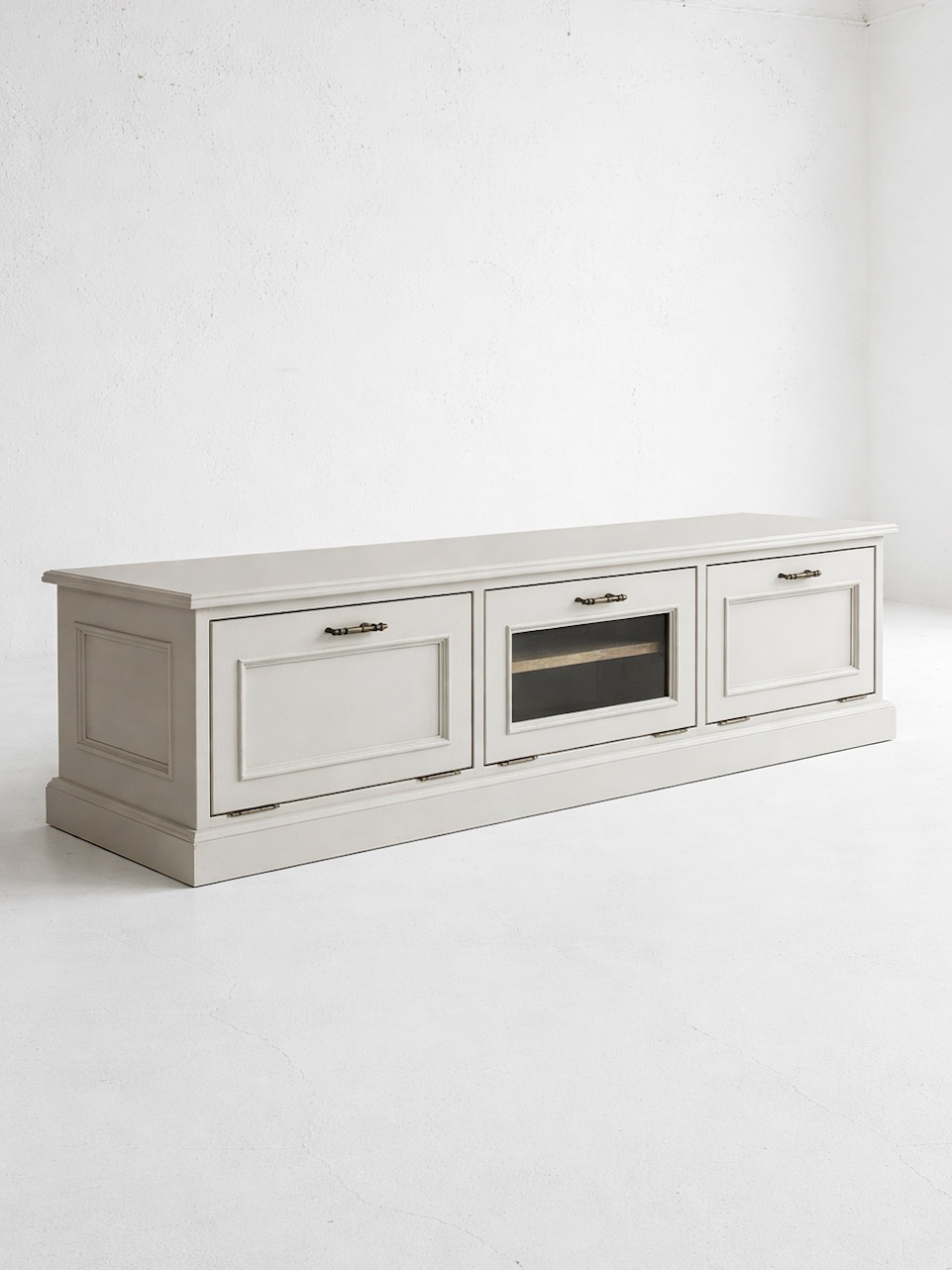 モールディングで立体的に装飾したアンティーク調デザインのローボードです。