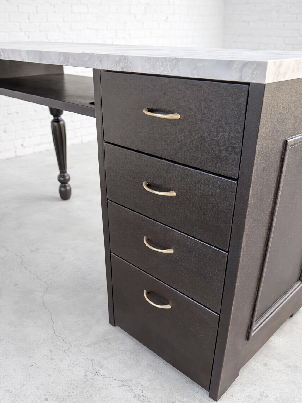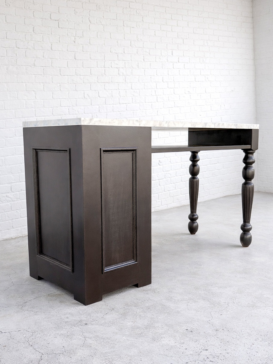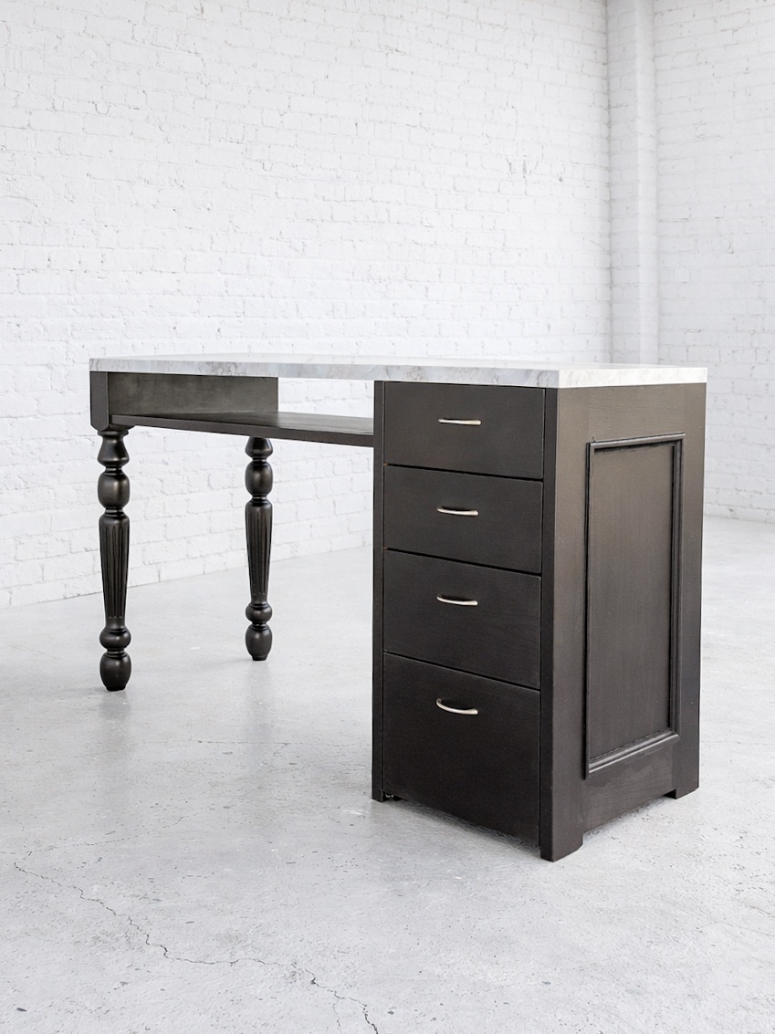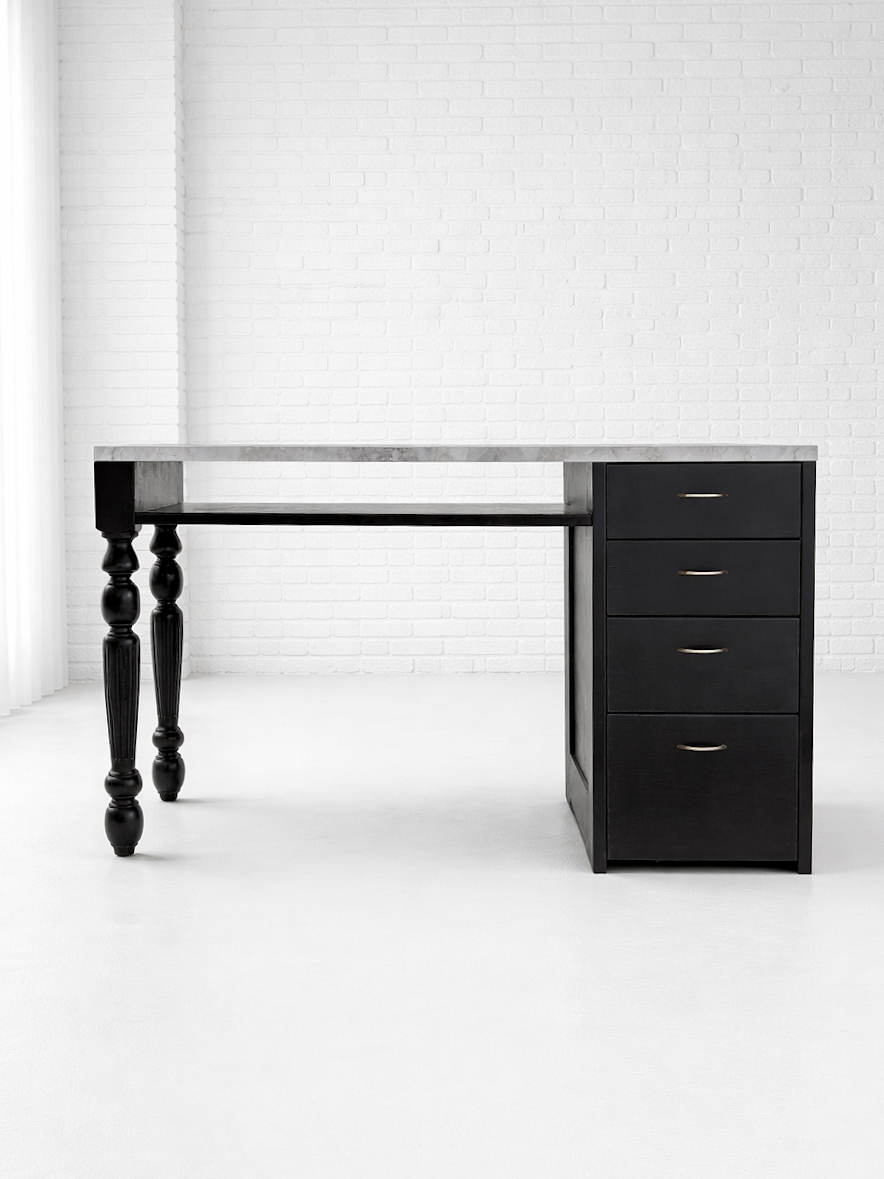 片方がろくろ足、片方がチェストになっている片袖デスク。チェストの左右入れ替えも可。
