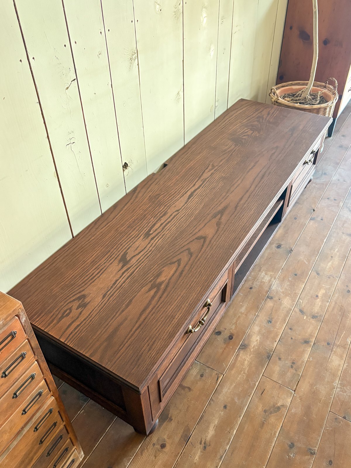 中央にオープン棚、左右に2段の浅い引出しを設置したアンティーク調テレビボード。