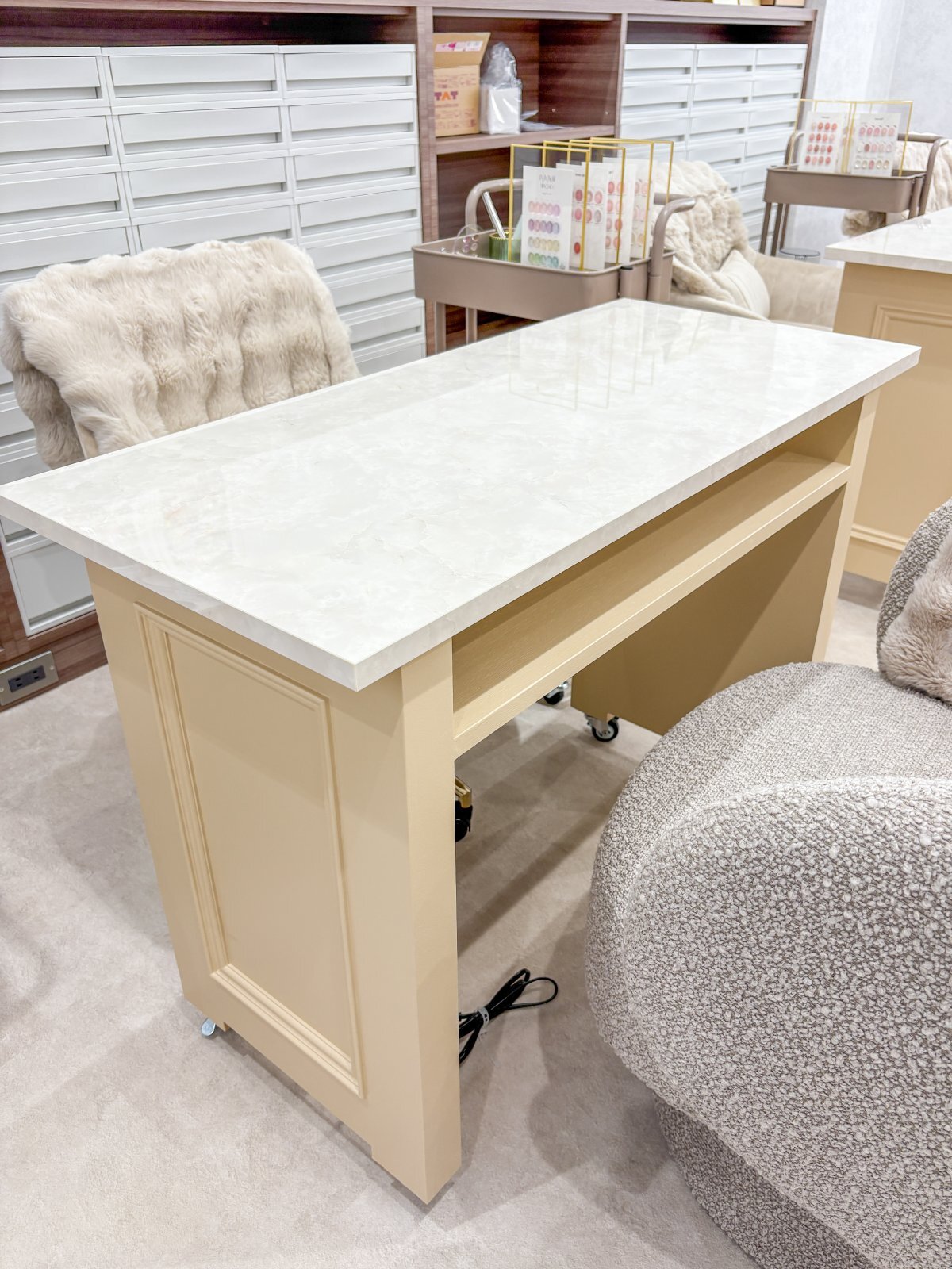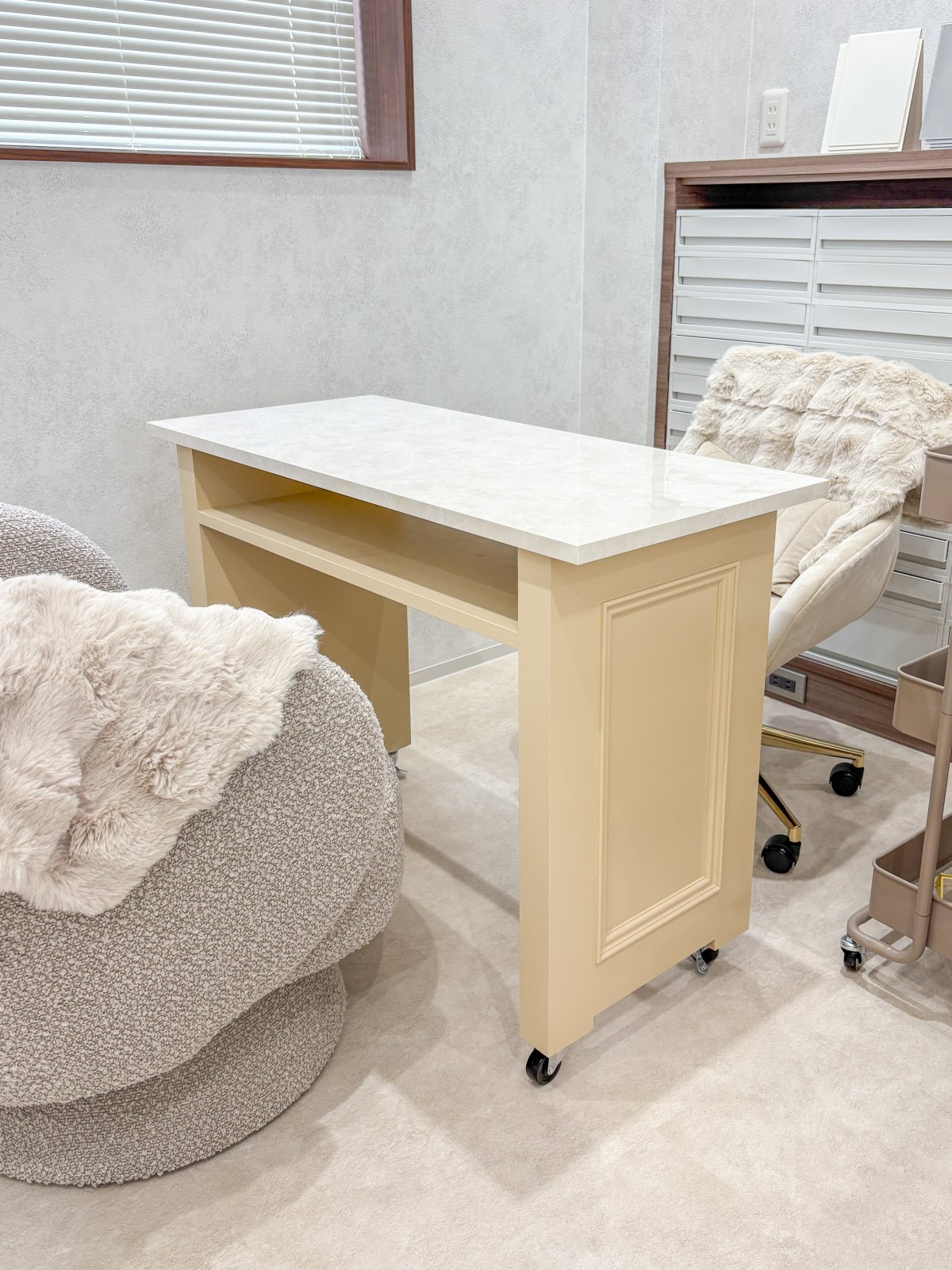 三重県にオープンするネイルサロンさんに、かわいい大理石天板のネイルデスクを製作させていただきました。