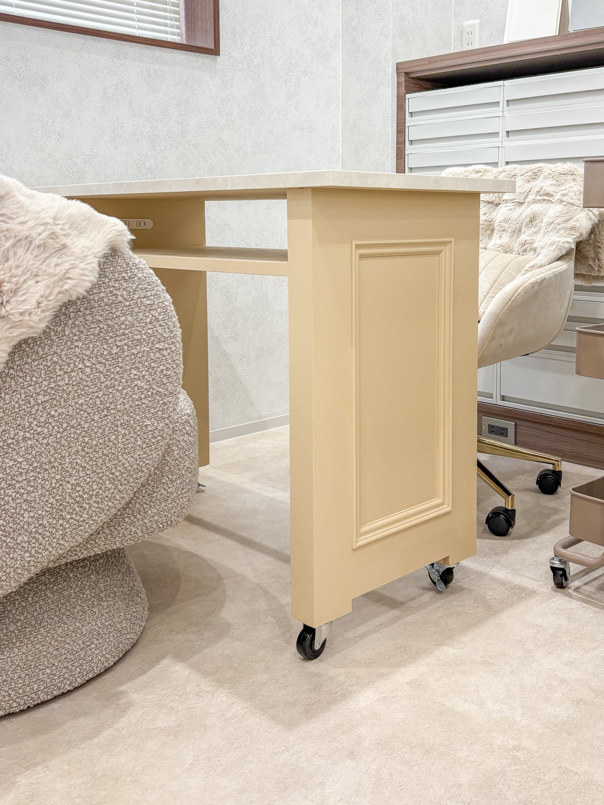引き出し付き、ろくろ足など、様々なデザインのネイルテーブルをオーダーメイドしています。