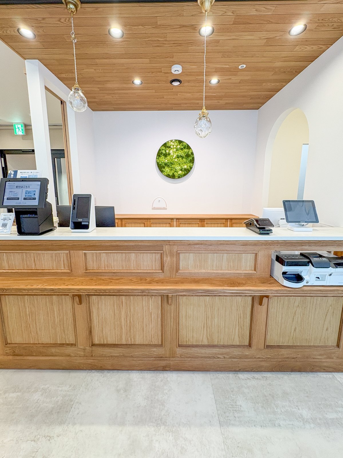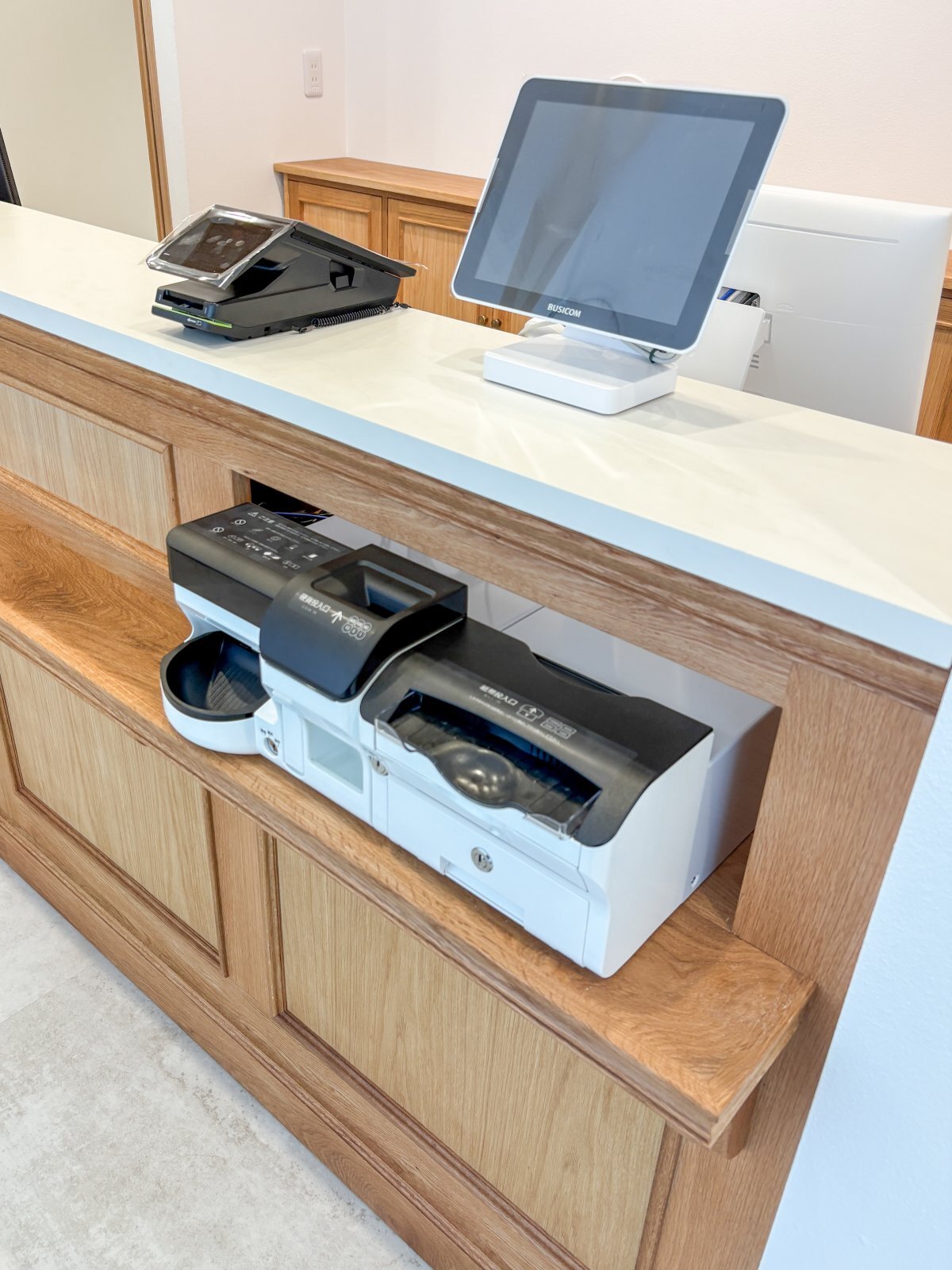 シンプルでいて豪華な見た目の受付カウンター、自動釣銭機を据え付けるスペースを特設。