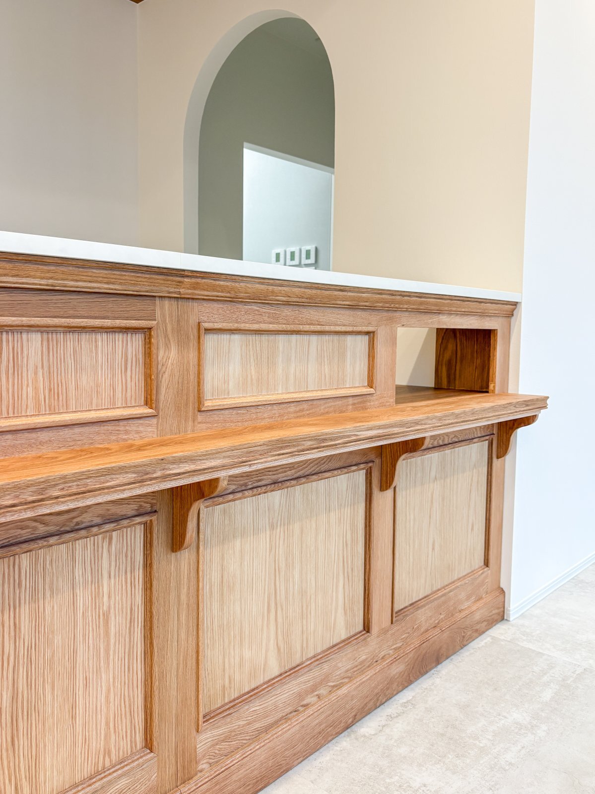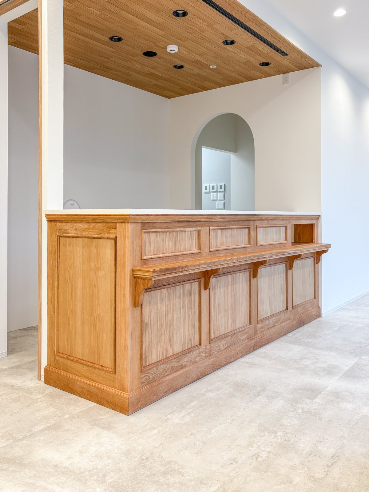 モールディングで立体的に飾り付けたアンティーク調の受付カウンターです。
