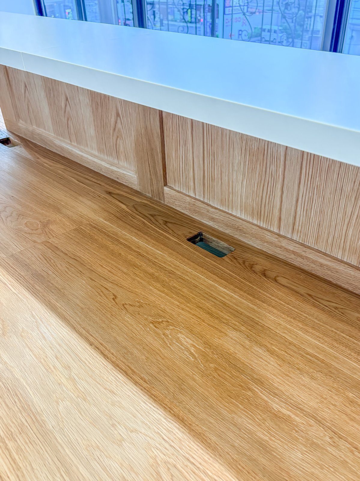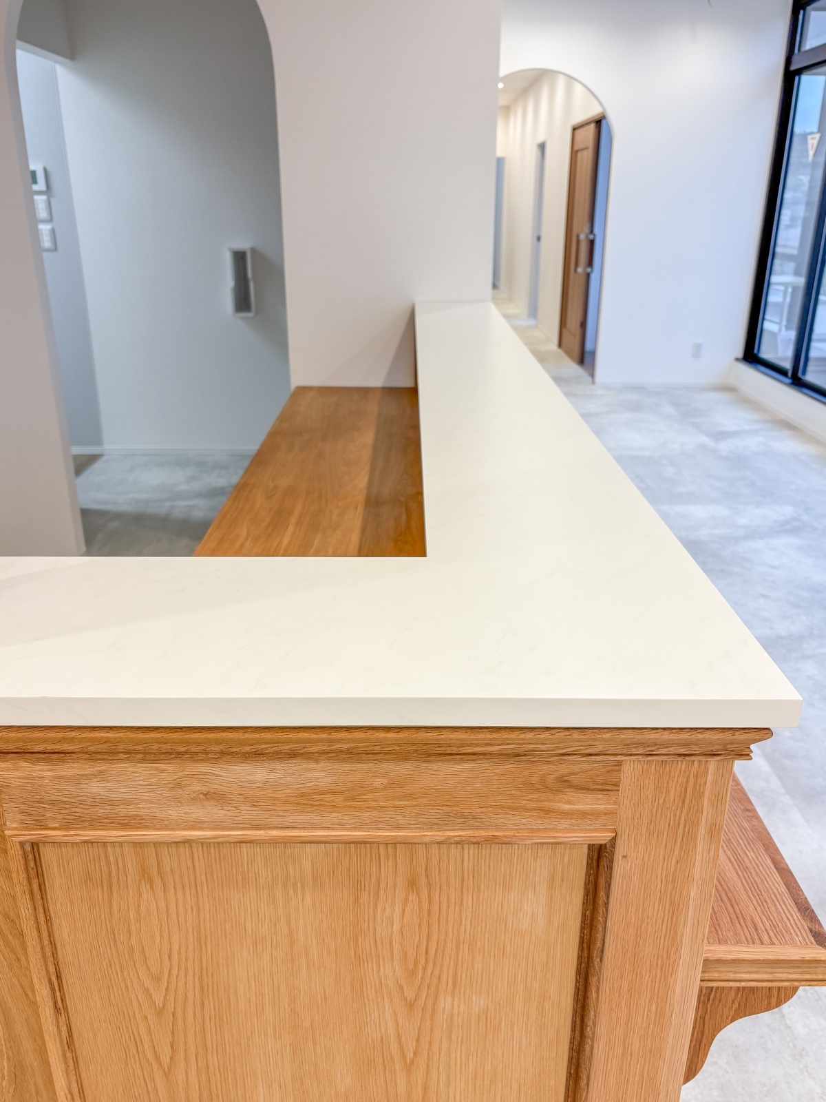 繊細な木目が特徴のホワイトオーク材で作った受付カウンター。