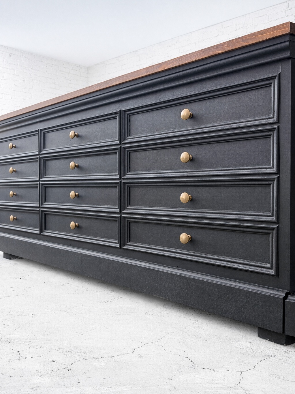 引出しが入っているように装ったフェイク装飾。真鍮金物が雰囲気を出してくれました。