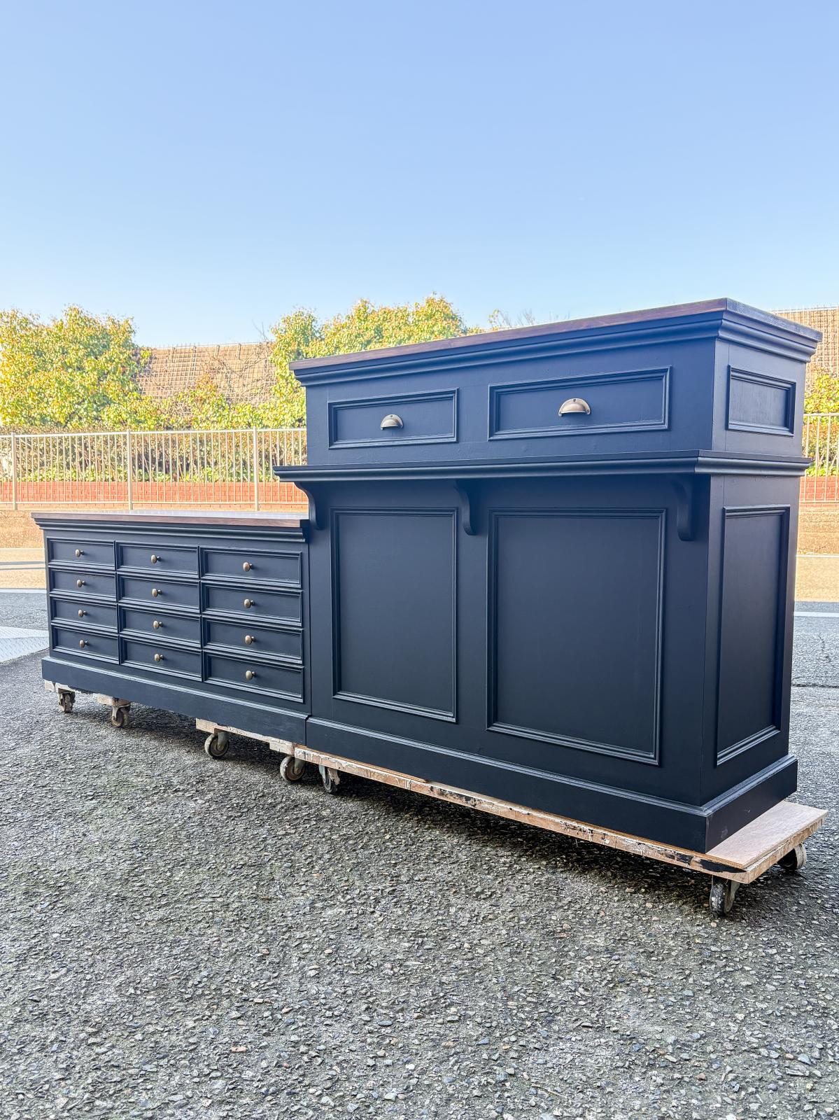 モールディングや真鍮金物で豪華に装飾した、アンティーク調デザインのショップカウンターセットです。