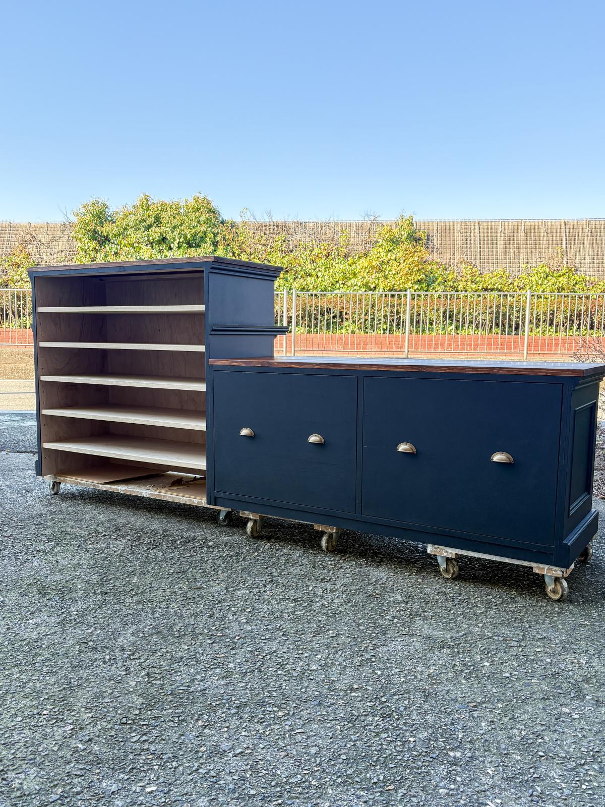 アンティークデザインのレジ台と展示台のセット、総幅250cmあります。
