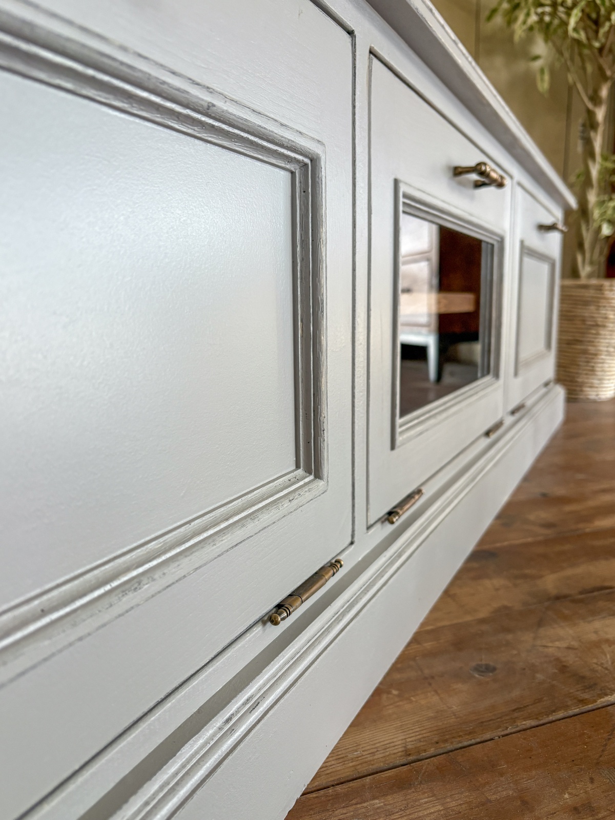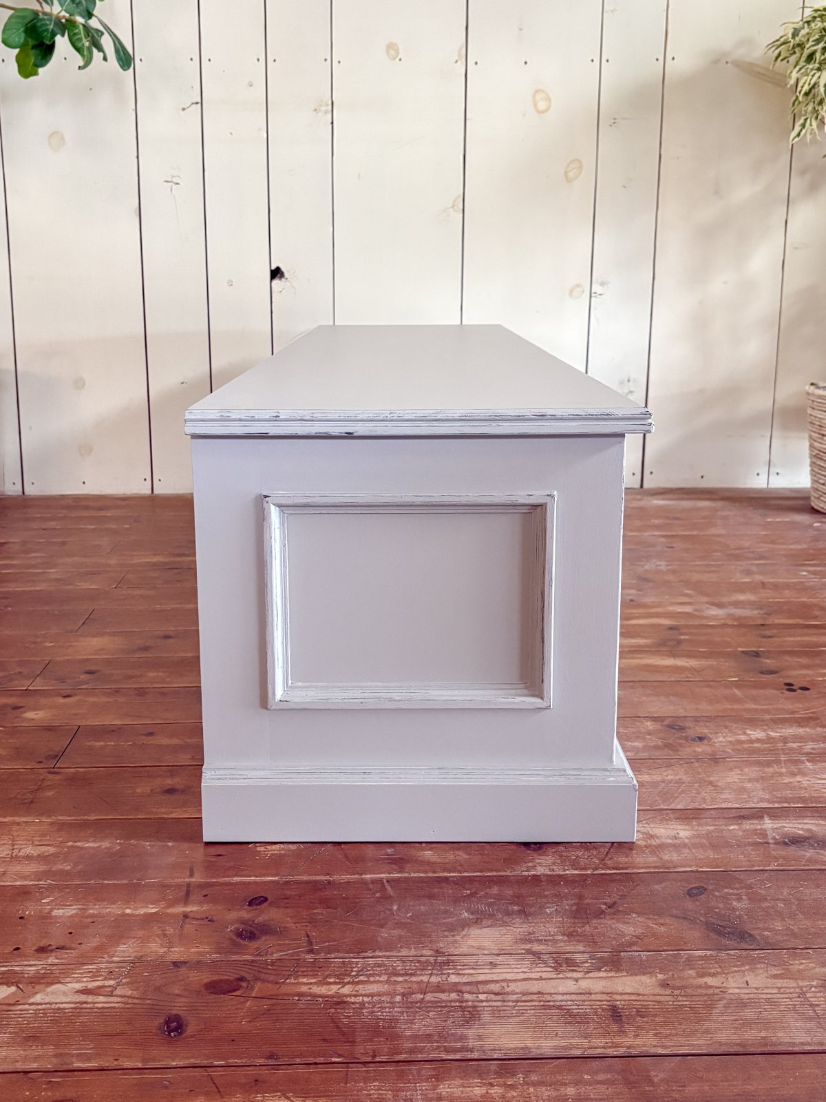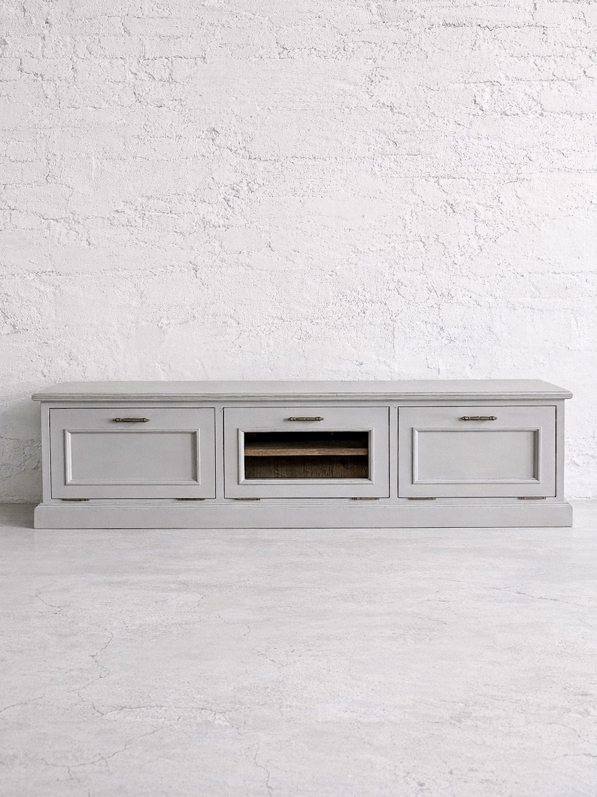 モールディング装飾やエイジングペイントを施した、アンティーク調デザインのテレビボードです。