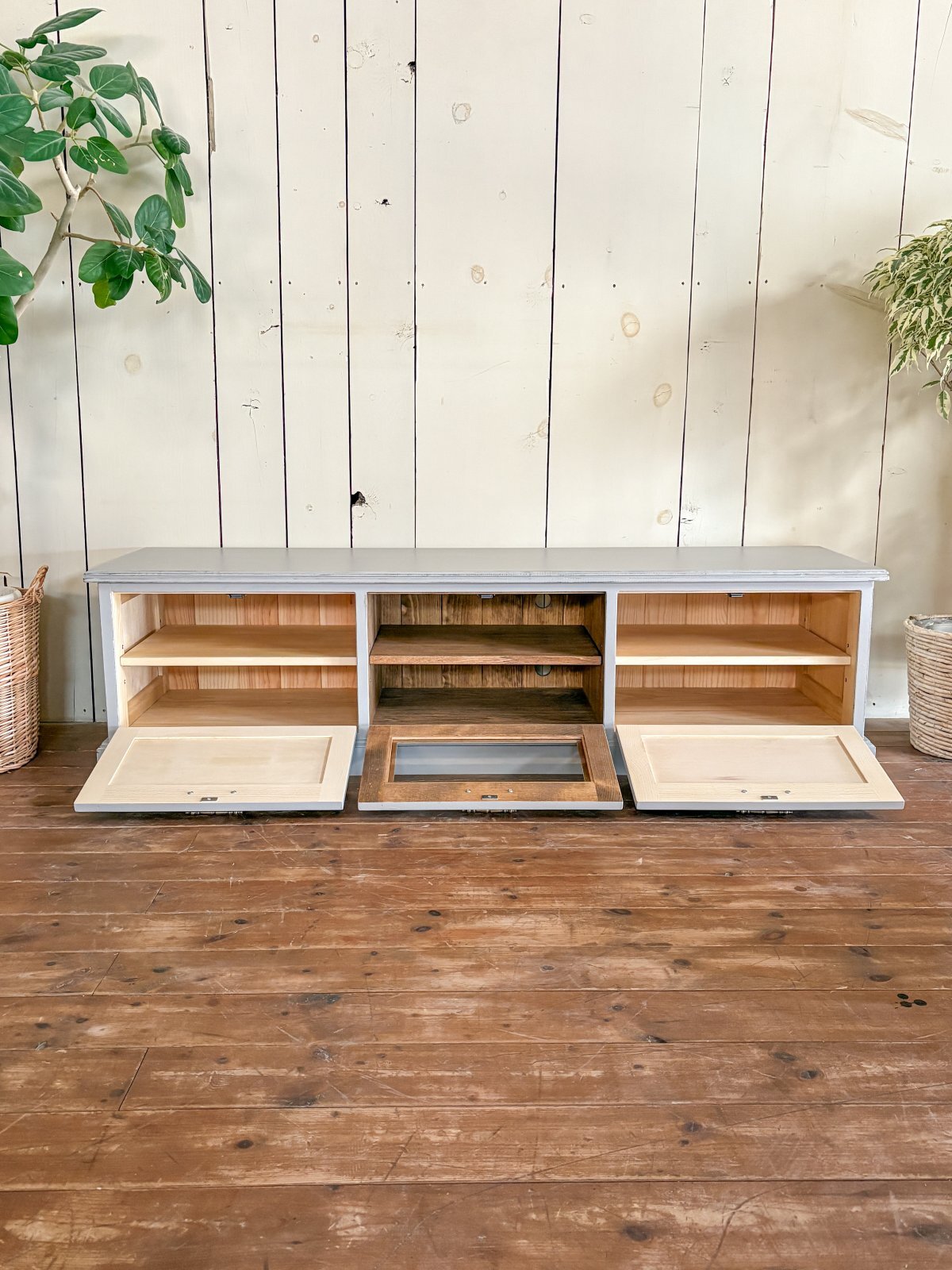 中央ガラス扉、左右は木扉で中に可動棚を1枚ずつ入れました。