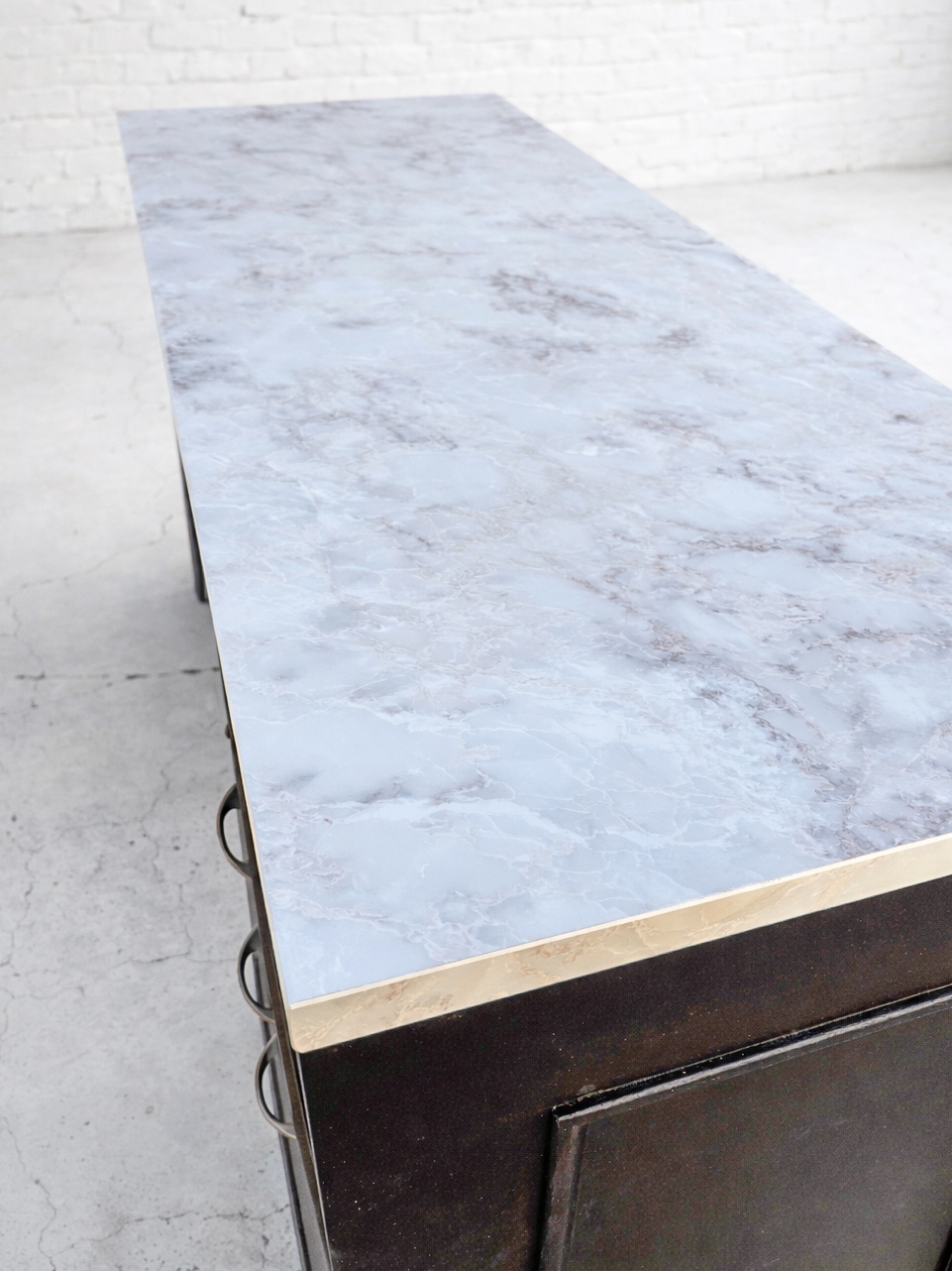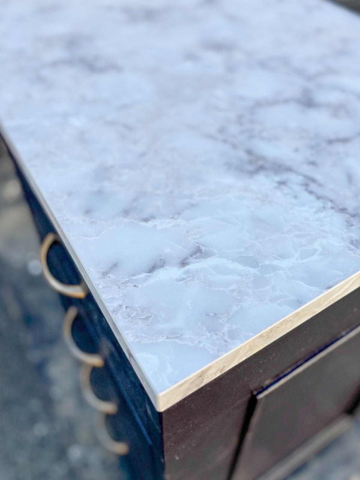 大理石柄のメラミン天板はキズと汚れに強く、アセントにも耐久性があります。