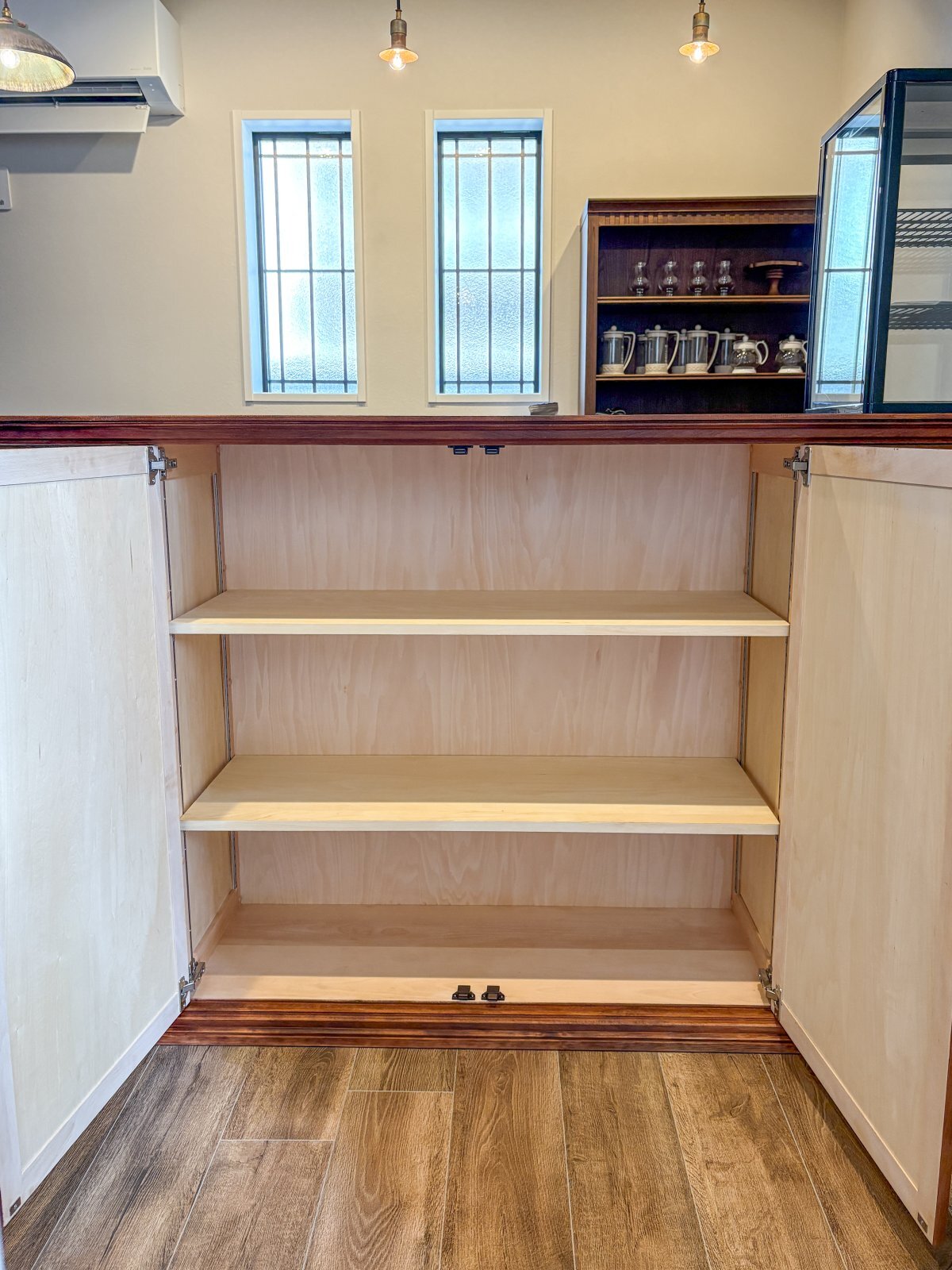 カウンター裏面は流しや台下冷蔵庫で塞がっているので、正面化粧パネルが全て扉になった、隠し収納カウンターです。