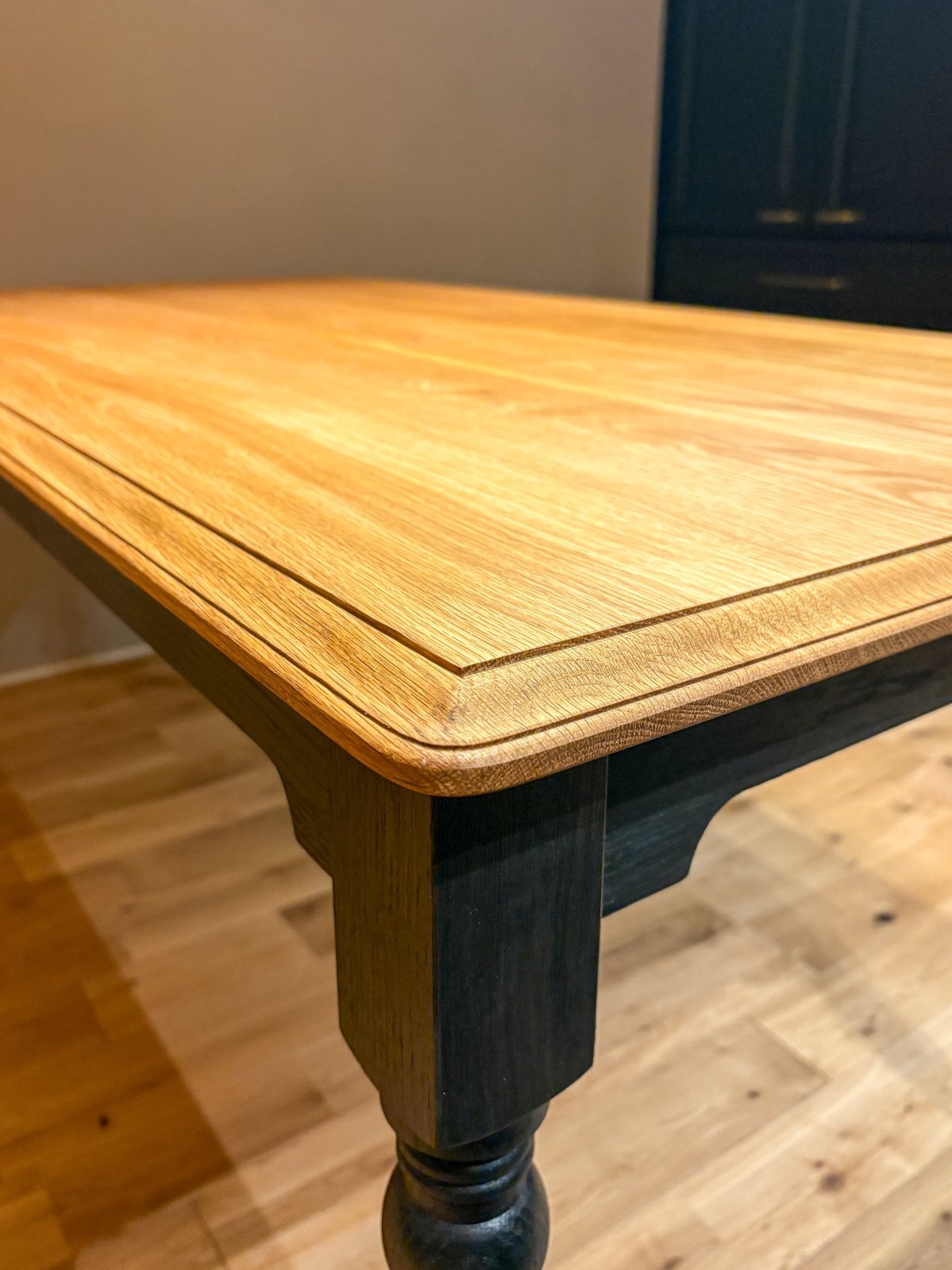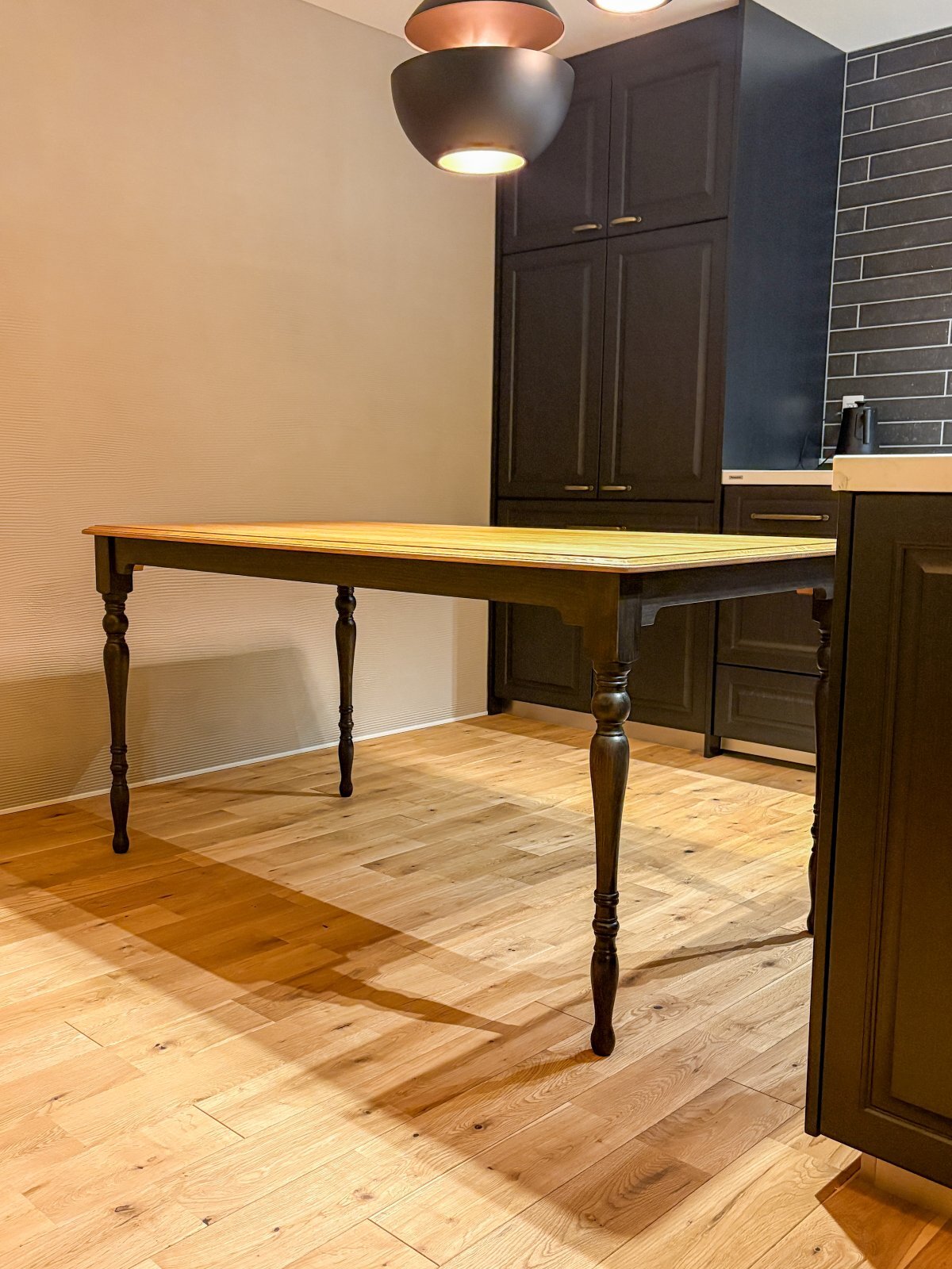 キッチンや椅子に合わせて、木目が見えるブラック塗装を施しました。男性でも足元が広く使えるように特注加工を追加。